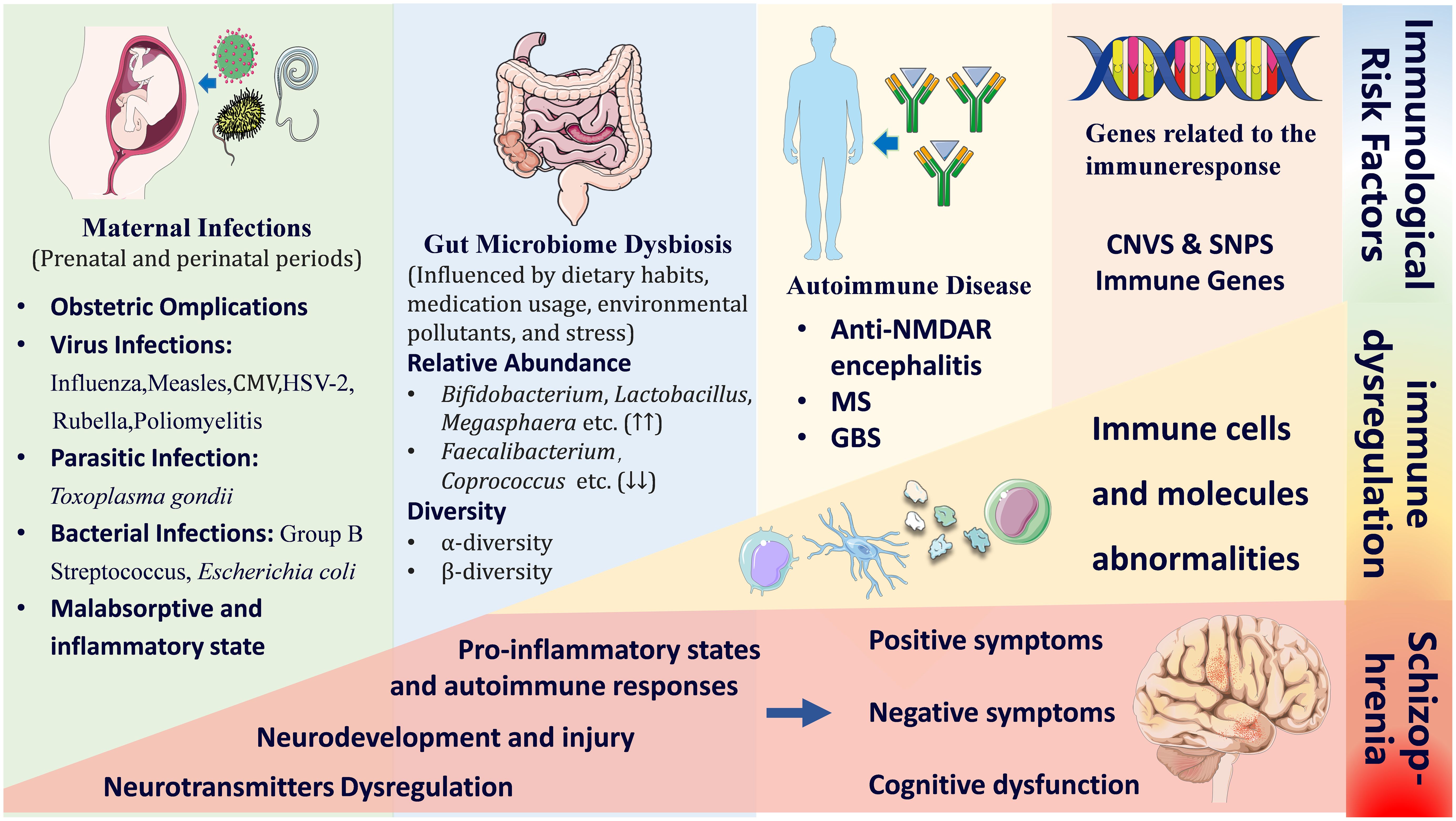 Figure 1. Immune-related risk factors that may induce schizophrenia and pathophysiological consequences. The figure provides an overview of the process by which immune-related risk factors disrupt the balance of the immune system, ultimately contributing to the development of SZ. The risk factors associated with immune system imbalance include intrinsic factors (such as autoimmune diseases) and extrinsic environmental factors (such as maternal infections, environmental exposures during early life, childhood, and the first episode of psychosis, as well as gut microbiota dysbiosis). Immune system imbalance is primarily reflected in abnormalities of immune cells, immune organs, and immune-related molecules. The pathological mechanisms by which immune system imbalance may lead to SZ include neurotransmitter dysregulation (abnormalities in dopamine/glutamate/GABA/5-HT), neurodevelopmental impairments (such as abnormal synaptic pruning and brain structural changes), inflammatory responses, autoimmune reactions, and related clinical symptoms (positive symptoms, negative symptoms, and cognitive deficits). CMV, Cytomegalovirus; HSV-2, Herpes Simplex Virus Type 2; MS, Multiple Sclerosis; GBS, Guillain-Barré Syndrome; CNVs, Copy Number Variations; SNPs, Single Nucleotide Polymorphism.
