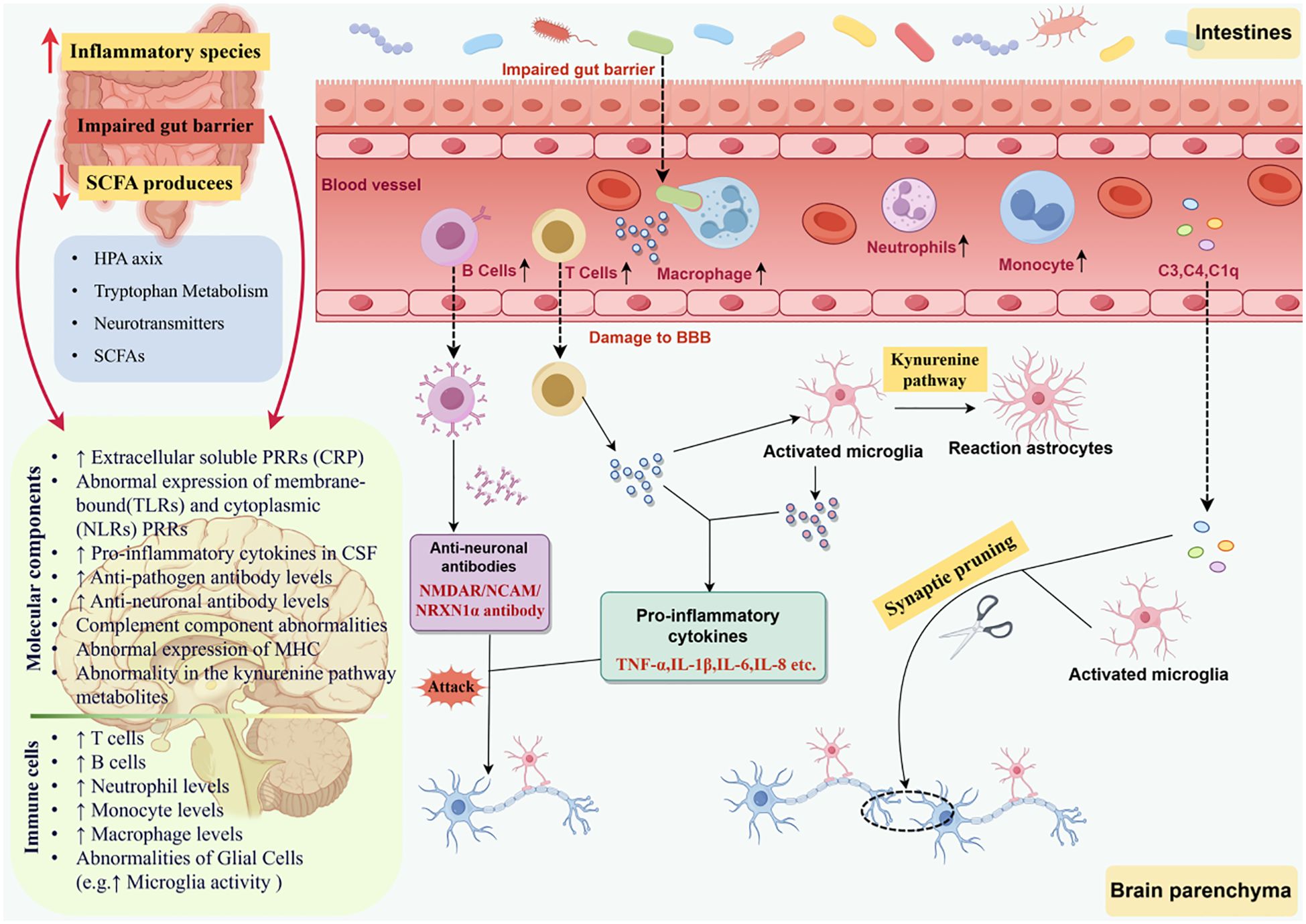 In the CNS, dysbiosis directly or indirectly modulates the function of microglia and astrocytes via metabolites including SCFAs. Aberrantly activated glial cells exacerbate neuroinflammation and influence synaptic pruning processes, with complement C4-mediated synaptic phagocytosis playing a critical role. Concurrently, pro-inflammatory cytokines regulate the activity of key enzymes in tryptophan metabolism—indoleamine IDO and TDO—promoting the production of kynurenine pathway metabolites such as KYNA. This disrupts multiple neurotransmitter systems, including dopamine, GABA, glutamate, and serotonin, further exacerbating neurotransmission dysfunction. Moreover, compromised intestinal barrier integrity and gut-derived microbial components such as LPS activate TLR/NF-κB/NLRP3 pathways, which not only drive systemic inflammation but also modulate gut-derived tryptophan metabolism and serotonin synthesis, thereby coupling immune regulation with neuromodulatory functions.