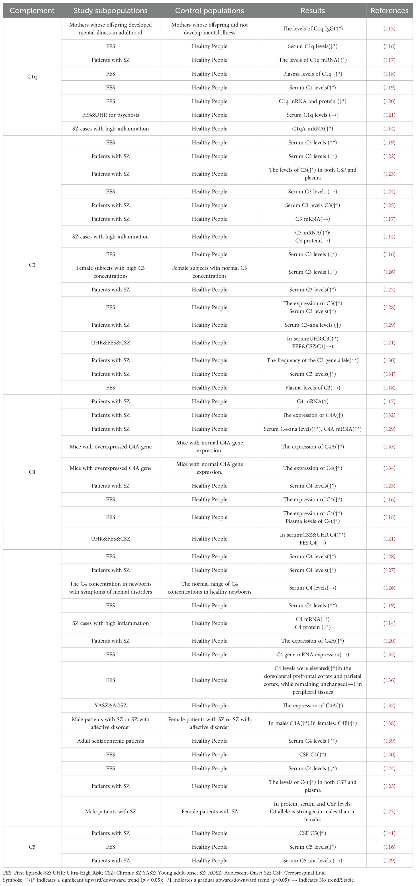 Current studies have identified elevated transcript levels of complement components (C1qA, C3, C4, C5) in patients with schizophrenia (114) (see Table 2), suggesting, albeit not entirely consistently, that increased activation of the classical complement pathway may be associated with SZ.