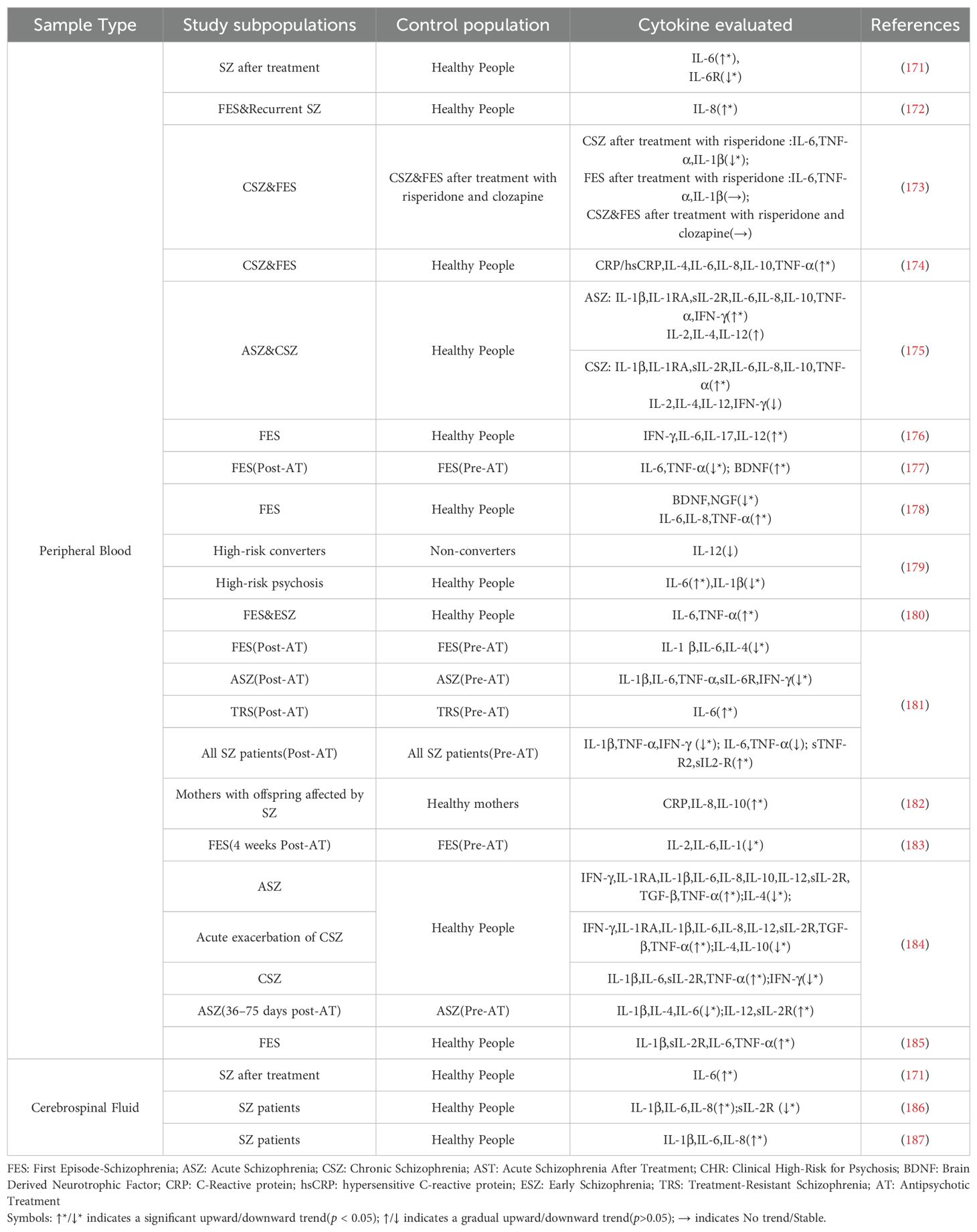 Given the dysfunction of the BBB in patients with schizophrenia, changes in cytokine levels in the periphery (peripheral blood) and the center (cerebrospinal fluid, CSF) are valuable for assessing the CNS inflammatory state. Numerous studies have identified abnormal alterations in various cytokines in the CSF and peripheral blood of SZ patients (see Table 3), most of which are pro-inflammatory cytokines (IL-1β, IL-2, IL-8, TNF-α, and IFN-γ) (188–191), with a smaller proportion being anti-inflammatory cytokines (including TGF-β1, IL-4, and IL-10) (192). The prevailing research view is that a dynamic imbalance between pro-inflammatory and anti-inflammatory cytokines may contribute to the pathogenesis of schizophrenia and subsequent psychopathological symptoms (193–196).