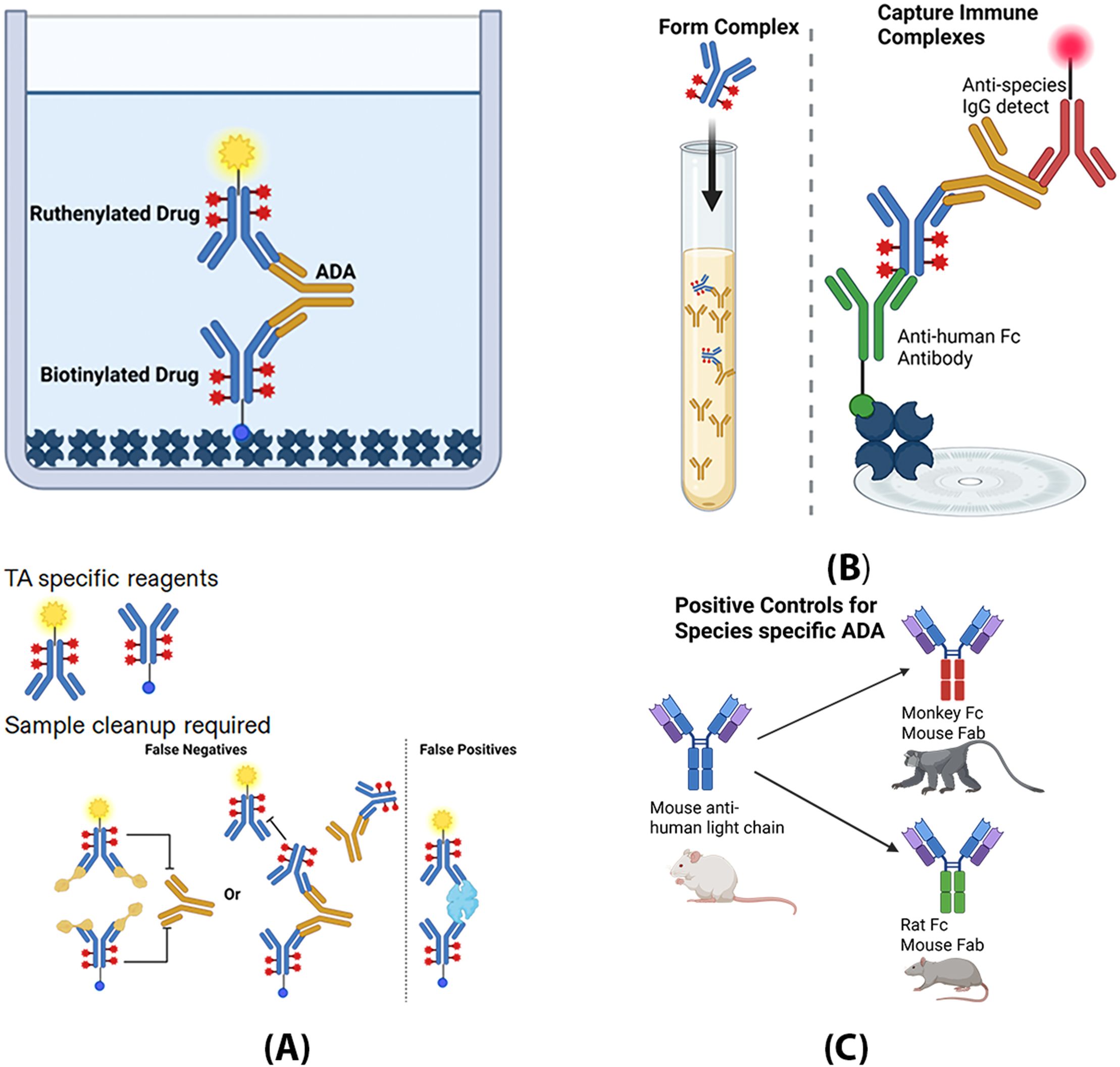 Figure 1. Generic and specific ADA assay formats. Panel (A) displays an ADA bridging assay that uses labelled drug as both capture and detection reagents. This approach requires dedicated reagents for each program and involves acid dissociation to process the sample. (B) The gyrolab-based generic ADA assay introduces drug to bind all free ADA; immunocomplexes are then collected using an anti-human Fc antibody and detected with an anti-species reagent. (C) A chimeric anti-human light chain antibody functions as a generic surrogate positive control for assay development and evaluation. This reagent is created by producing a mouse antibody and substituting the heavy chain portion with those from specific nonclinical species, such as cynomolgus monkey or rat, tailored for each ADA assay.