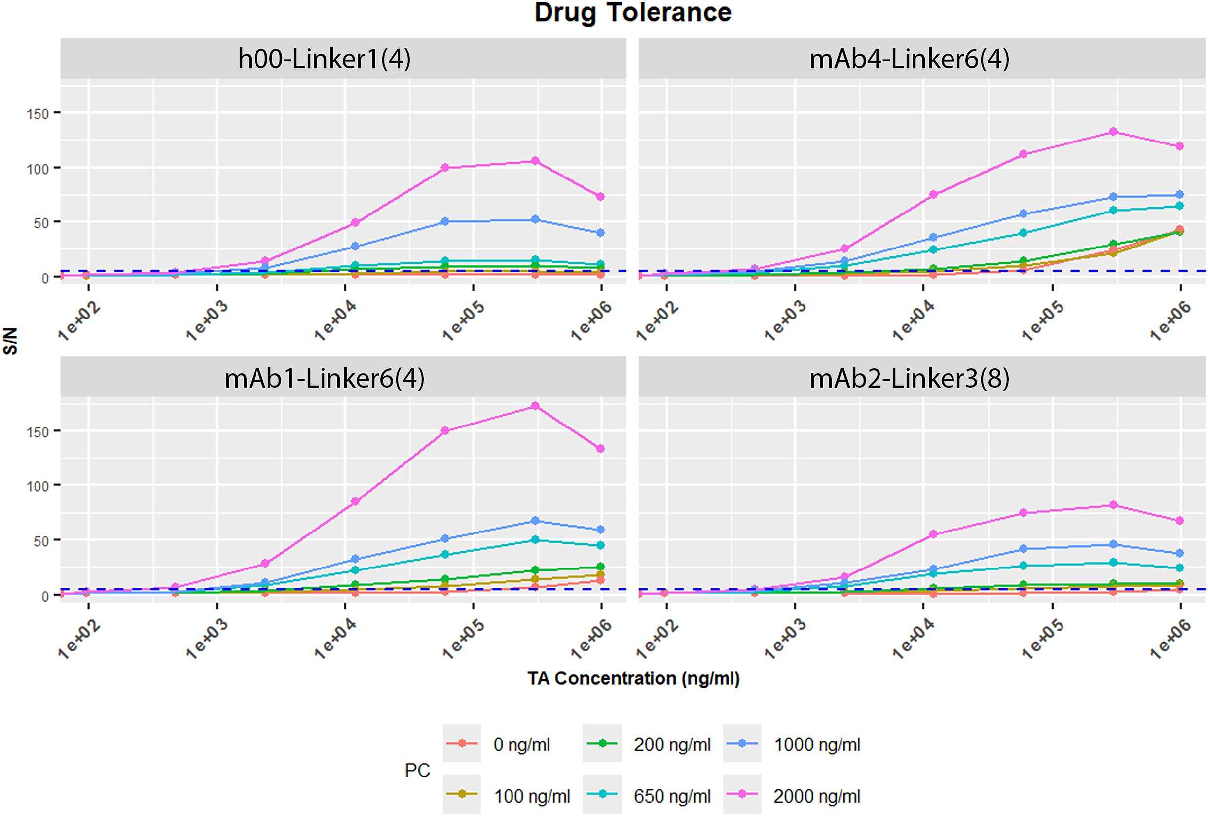 Figure 2. Drug tolerance data used to determine the amount of drug spikes. Drug tolerance was evaluated in four ADCs using various estimated cut points. Samples had PC levels from 2000 ng/mL to 100 ng/mL. The blue line indicates a S/N of 3 for estimating the cut point. All four ADCs were drug tolerate up to 1 mg/mL with 650 ng/ml of PC in sample.