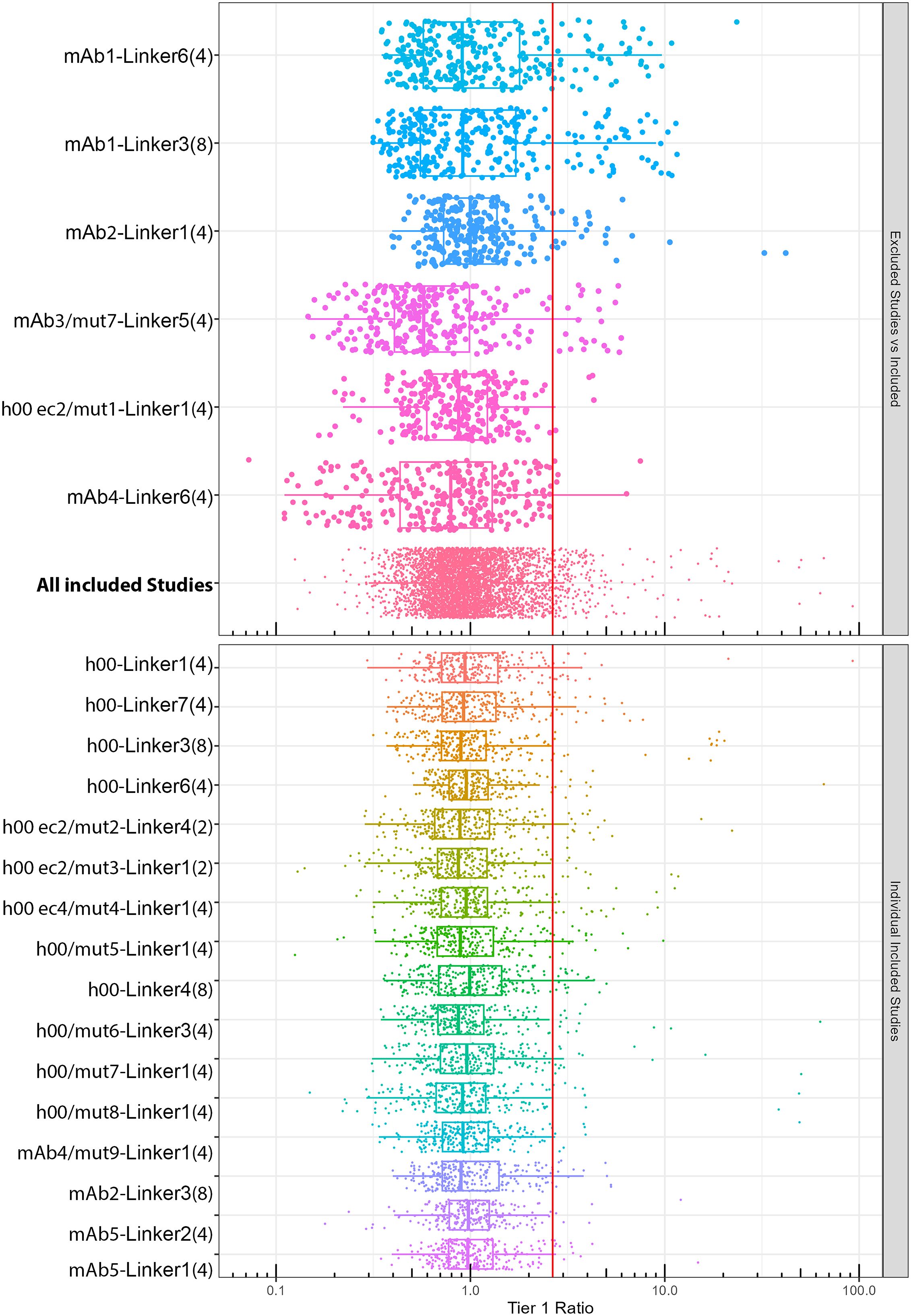 Figure 3. Cutpoint analysis: Plasma samples from fifty naïve cynomolguses were tested six times for each of twenty-two ADCs. The 95th percentile cut points were calculated using a non-parametric method after removing outliers. A chi-squared test showed that 16 of 22 ADCs could share a common cut point of 2.64 (red line, lower panel). Data from these ADCs were pooled and compared with the excluded six ADCs, as shown in the upper panel.