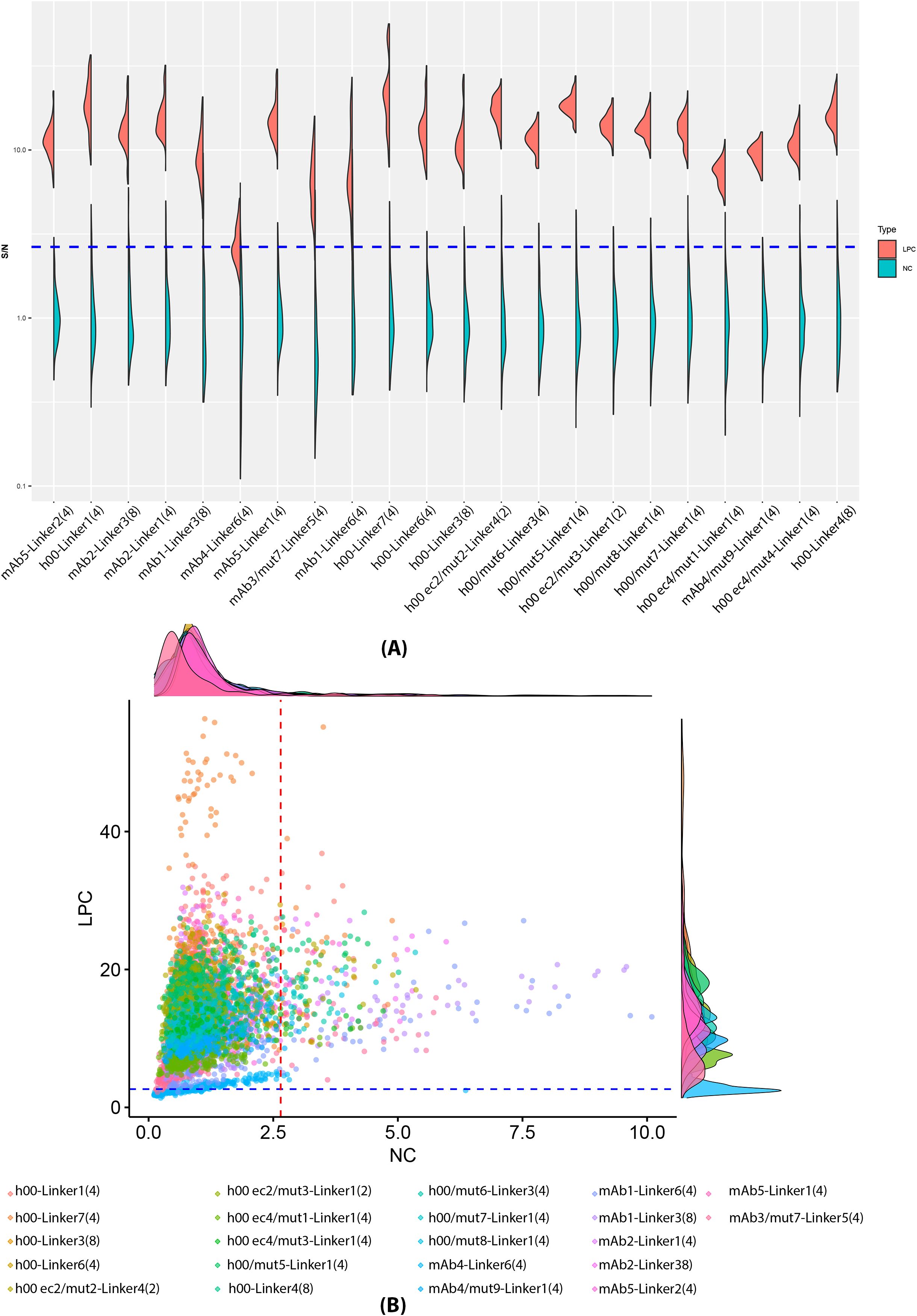 Figure 4. Naïve individual (NC) and LPC (650 ng/ml) spiked sample response in twenty-two unique ADCs A surrogate positive control targeting the light chain were spiked into the 50 cynomolgus at an LPC level of 650 ng/mL, with gADA ran with twenty-two ADCs. Naïve and LPC spiked individuals are compared shown in (A, B) Red and blue lines represent the 2.64 cut point.
