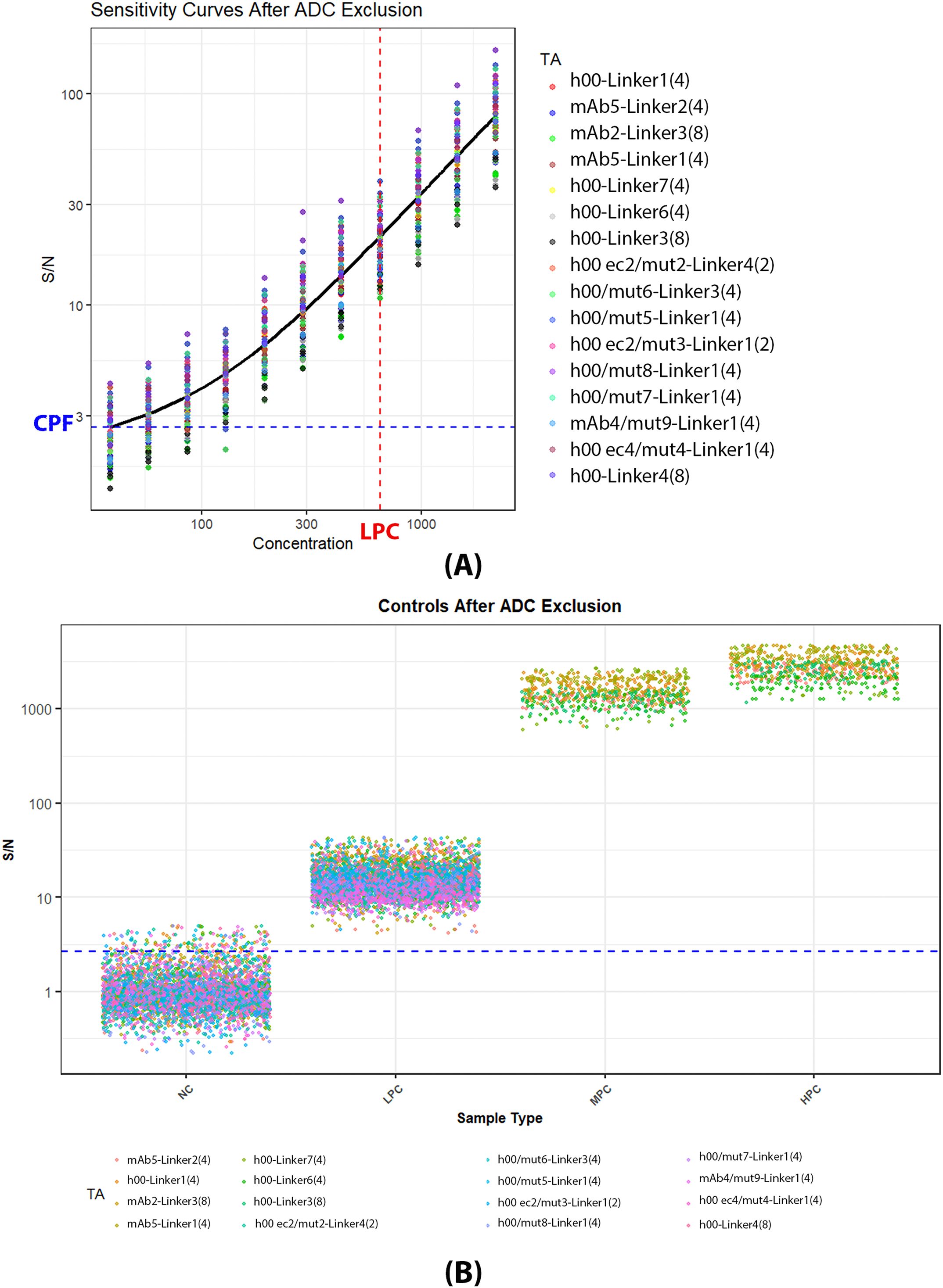 Figure 5. Combined sensitivity and positive control after homogeneity exclusion. Sensitivity curves for the 16 included ADCs were run. (A) show combined sensitivity curve with a 4-PL fit, blue line represents 2.64 universal cut point, red line presents the 650ng/mL LPC. MPC and HPC were set at 40,000 ng/mL and 100,000 ng/mL. (B) demonstrates the distribution of PCs compared to NC and cut point (blue line), all LPCs for 16 included ADCs passed the cut point, and within each individual ADC, HPC > MPC > LPC.