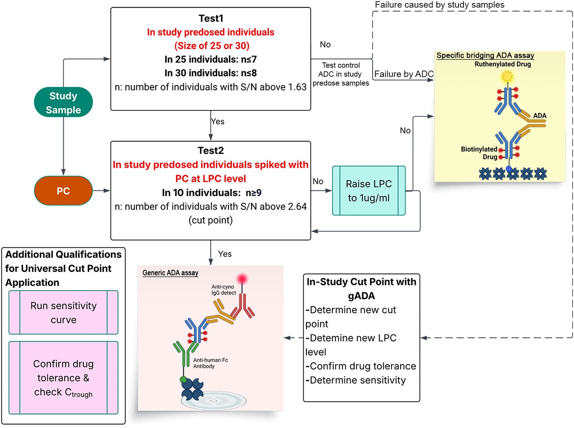 Before applying a generic assay and cut point to new ADCs, certain checks are necessary. Figure 7 presents a flow chart for GLP studies with two steps: First, test serum samples from at least 25–30 predose animals (or naïve substitutes) with the new ADC as reagent. Calculate S/N against the control pool; if less or equal than 8 out of 30 samples or 7 out of 25 exceed 1.63, proceed to the sequential test. Otherwise, conduct further assessment to determine whether the failure is attributable to ADC or study samples. If incompatibility with ADC is identified as the cause, a specific bridging assay will be used; if not, an in-study cut point with the gADA assay can be considered. The sequential test involves spiking predose samples at LPC levels; if criteria are met, apply the generic assay with the 2.64 universal cut point, if not, it is unapplicable. Additional qualification experiments—such as adjusting LPC through a PC sensitivity curve or confirming drug tolerance—may be added as fit for purpose. In studies with a small sample size of less than 25 animals, where no statistical cut off can be drawn with first test, unless all the pre dosed animals have S/N under 1.63, an in-study cut point for will be recommended for gADA.