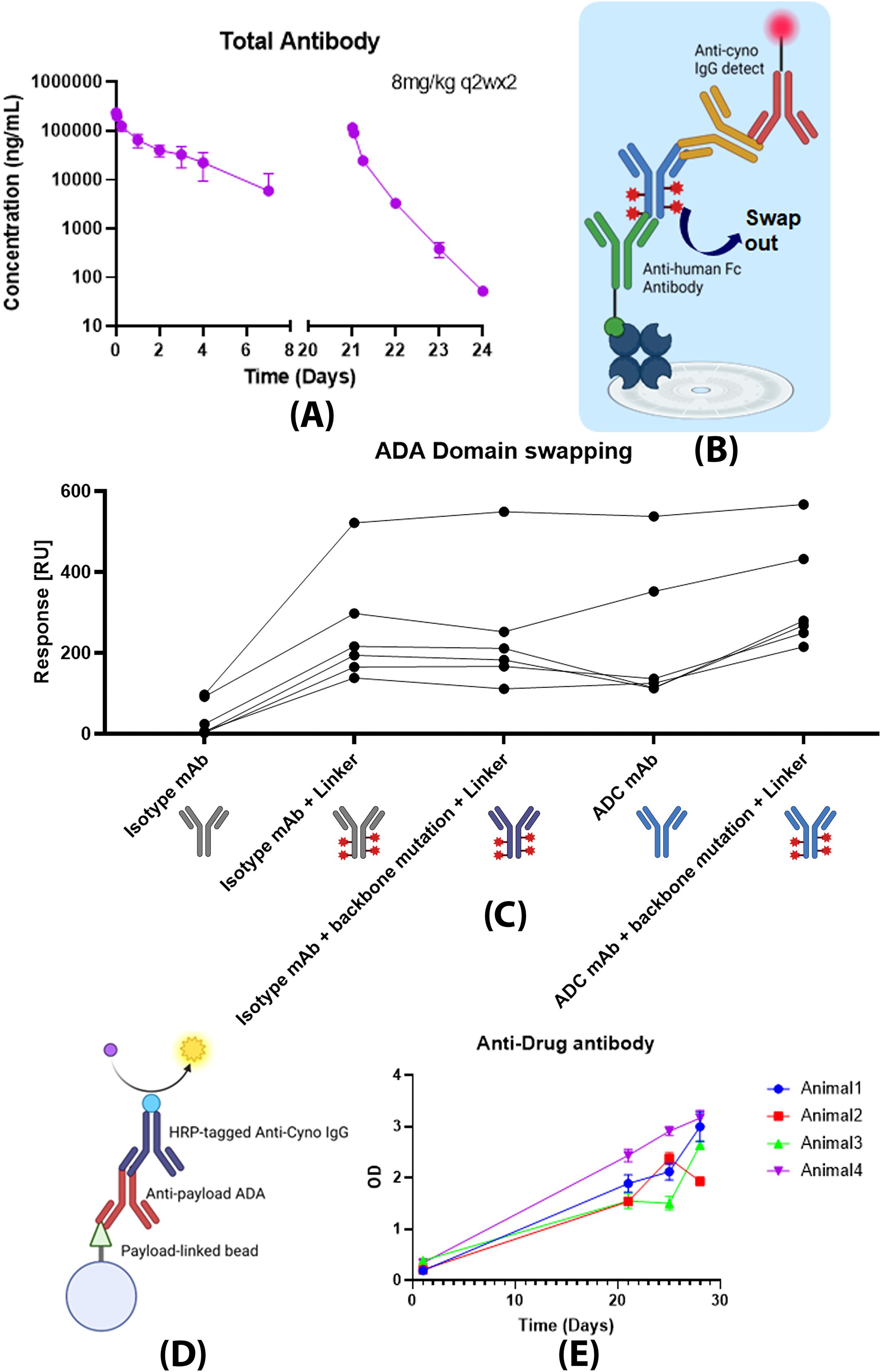 Figure 8. Case study utilizing gADA for domain specificity. (A) Presents total antibody concentrations measured in a cynomolgus pharmacokinetic (PK) study at an 8 mg/kg Q2W2 dosing regimen, with the second dose demonstrating evidence of accelerated clearance. Whole study design is described in Supplementary Information. ADA was analyzed for predose and trough-level samples. In the trough-level samples, alternative ADCs containing distinct protein therapeutic components were substituted for the ADC therapy depicted in (B). (C) Assay responses for therapeutic agents (TAs) with different ADC domains were assessed across selected ADA-positive animals tested (n=6), with each animal depicted as a separate data point on the graph. The responses indicate anti-drug antibodies (ADA) directed toward both the backbone and linker regions. (D) A direct ELISA assay was performed to detect linker-specific ADA. The data shown in panel (E) corroborates the presence of ADA targeting the linker.