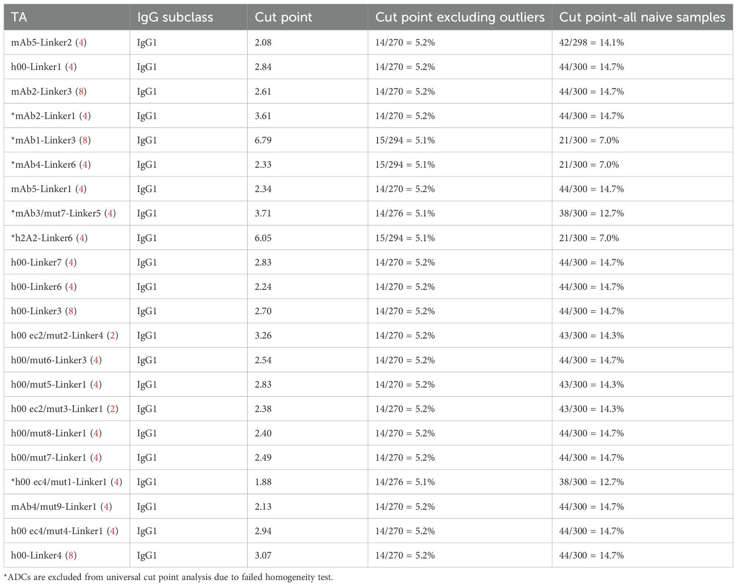 Outliers samples for each of the ADC test articles were identified by first log transforming the S/N data normalized to naïve cyno pool on each CD and evaluating the upper and lower limit of 1.5 times the interquartile range (IQR) calculation. Log-transformed data outside the set bounds are excluded as outliers. Before cut point analysis, plasma reactivity in naïve individuals was screened, excluding outliers (see Supplementary Figure 3). A single cut point at the 95th percentile was identified for a combined group of 16 similar studies using quantile regression, with ADC as the independent variable and S/N value as the dependent variable. Consistency of the 95th percentile among the combined 16 studies was assessed using a chi-squared test of homogeneity (chi-squared test, Table 1); other studies with different tails were excluded.