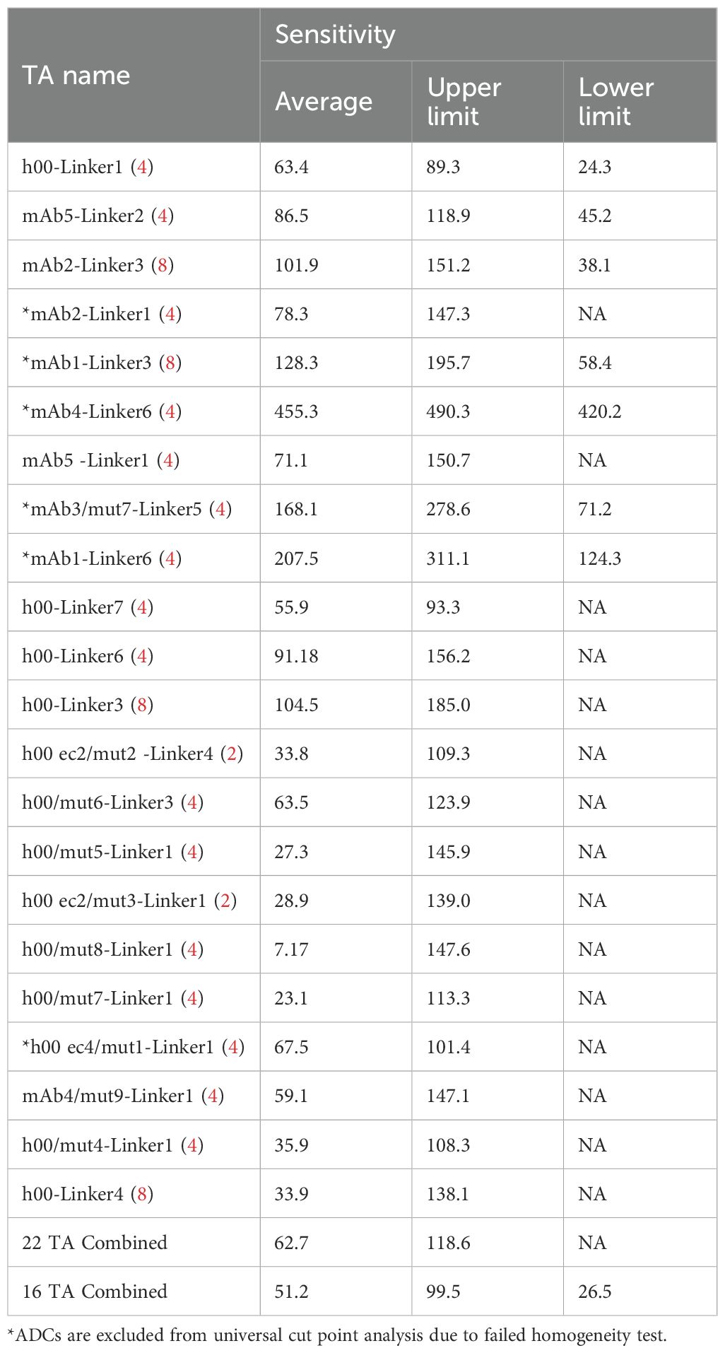 Four independent sensitivity curves serial diluted from 2193.8 to 38 ng/mL in pooled cynomolgus plasma were ran for all twenty-two ADCs, shown in Supplementary Figure 2. As listed in Table 2, at the universal cut point of 2.64, the average assay sensitivity of each individual ADC ranged from 7.17 to 455.3 ng/mL in all ADCs tested. After excluding the six outlier ADCs, assay sensitivity for each individual ADC ranged from 7.17 to 104.5 ng/mL with an upper limit of 89.3 to 185 ng/mL. Combined sensitivity of sixteen included ADC is demonstrated in both Figure 5A and Table 2, showed an average sensitivity of 51.2 ng/mL with an upper limit of 99.5 ng/mL close to the targeted value of 100ng/mL. Due to the differences in sensitivity among ADCs, a sensitivity assessment should be conducted for each ADC evaluated during study applications.