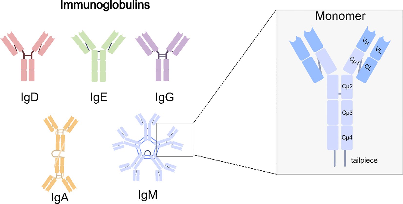 Figure 1. Human immunoglobulin isotypes and IgM structure. Schematic representation of the five major immunoglobulin classes. Among them, IgM is secreted predominantly as a pentamer, conferring ten antigen-binding sites and high avidity. The right panel depicts the IgM monomer, highlighting the variable domains (Vμ, VL), constant domains (Cμ1–Cμ4, CL), and the tailpiece that is essential for multimerization.