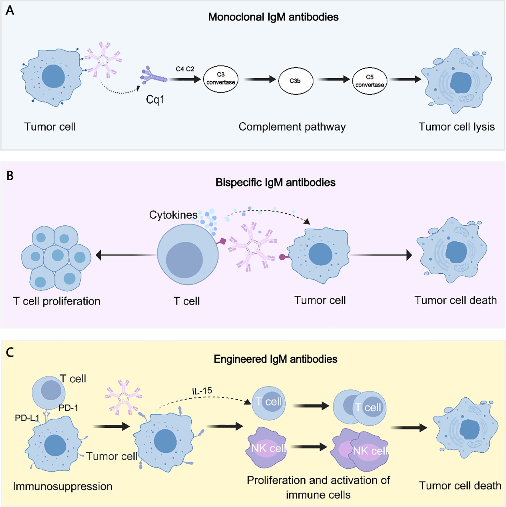 Figure 2. Antitumor mechanisms of IgM antibody formats. (A) Monoclonal IgM antibodies mediate tumor cell lysis primarily through potent activation of the classical complement pathway. (B) Bispecific IgM antibodies concurrently engage tumor-associated antigens and T cells, thereby promoting cytokine release, immune synapse formation, and tumor cell cytotoxicity. (C) Engineered IgM antibodies are designed to overcome immunosuppression (e.g., targeting the PD-1/PD-L1 axis) and to stimulate proliferation and activation of effector immune cells, such as T cells and NK cells, ultimately inducing tumor cell death.