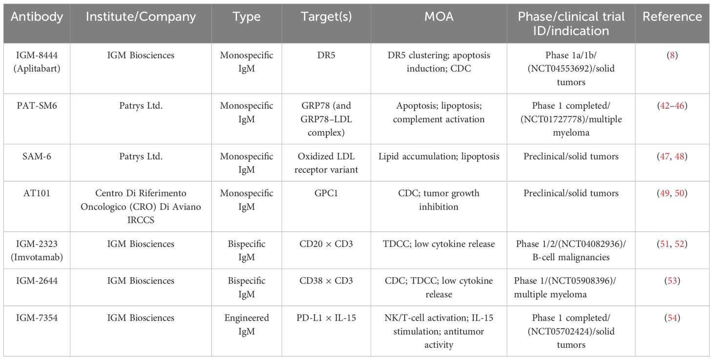 Several mIgM antibodies have shown encouraging preclinical and early clinical potential. IGM-8444 (Aplitabart), although molecularly engineered to enhance DR5 clustering and agonistic signaling, remains a monospecific IgM antibody and is therefore discussed within the monoclonal IgM category (Table 1). Preclinical studies revealed that IGM-8444 binds DR5 with high affinity and induces potent cytotoxicity compared with IgG agonists (8). In Colo205 cells, IGM-8444 was more than 10,000-fold more potent than anti-DR5 IgG. Importantly, it exhibited no hepatotoxicity at concentrations up to 500 μg/mL, whereas TNF-related apoptosis-inducing ligand (TRAIL) induced toxicity with an IC50 of 0.04 μg/mL. Broad screening across 190 cancer cell lines representing 15 solid and 5 hematological tumors showed strong responses in 25 cell lines (IC50 < 2 ng/mL), moderate responses in 75, and weak responses in 90. Combination studies further demonstrated synergistic activity with chemotherapy agents and the BCL-2 inhibitor ABT-199, without additional hepatotoxicity. In vivo, IGM-8444 inhibited tumor growth in a dose-dependent manner and achieved complete remission in the gastric PDX model. Collectively, the multivalent structure and efficient cross-linking ability of IGM-8444 address key limitations of IgG-based agonists, providing a promising approach for DR5-targeted therapy.