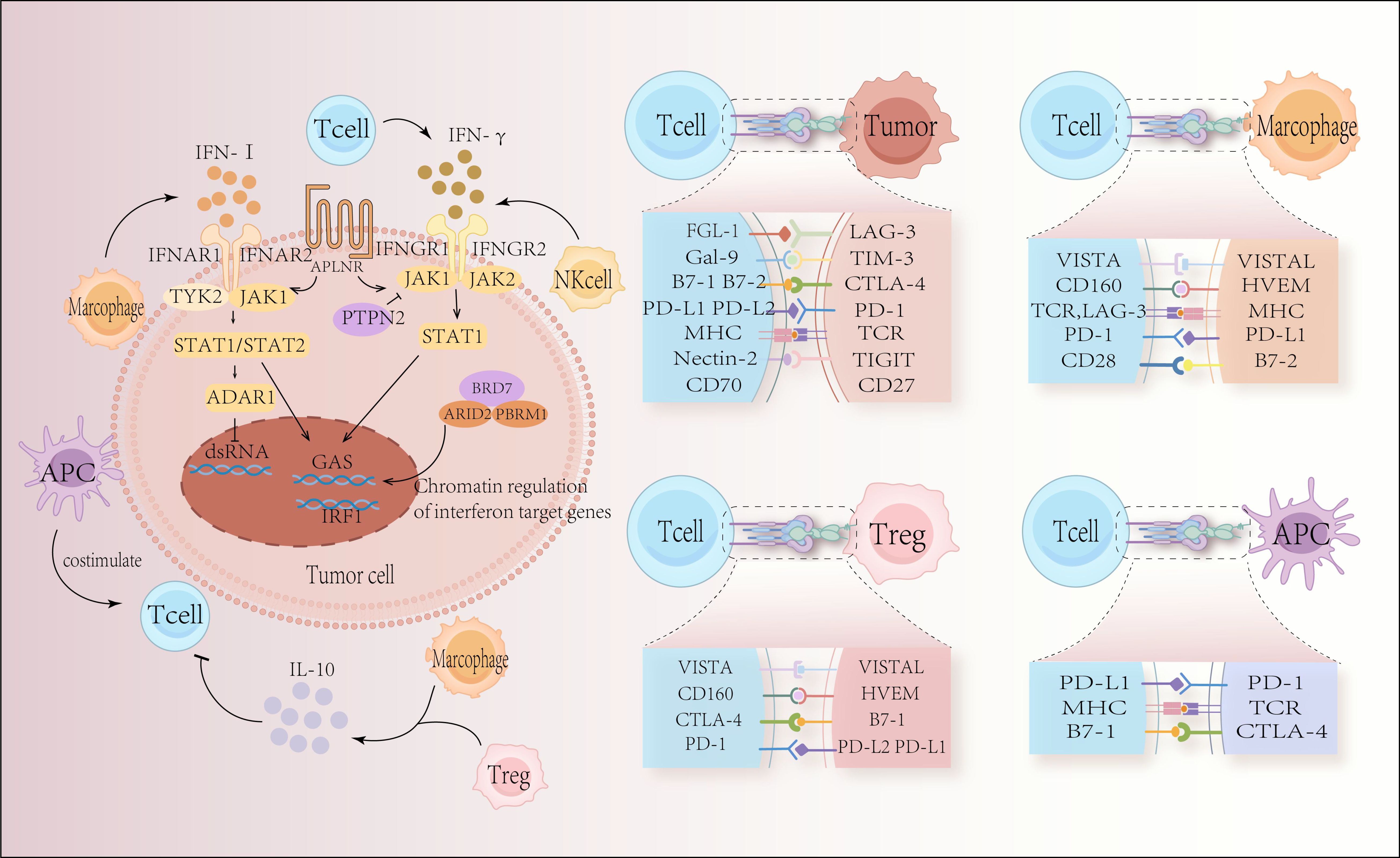 Figure 1. Tumor-intrinsic escape mechanisms and the interaction between immune cells and tumor cells through immune checkpoints. In response to immune checkpoint blockage and T-cell proliferation-based immunotherapy, tumor-endogenous interferon signaling plays a crucial role. The success or failure of immune checkpoint blockade depends on elements of the type I interferon signaling pathways and interferon gamma (IFNγ) signaling pathways, including Janus kinase 1 (JAK 1), JAK 2, signal transducer and activator of transcription 1 (STAT 1), and IFNγ receptor I (IFNGR 1) and IFNGR 2. The surface receptor apelin receptor (APLNR) regulates upstream sensitivity to IFNγ and type I interferon signaling; the tyrosine protein phosphatase non-receptor type 2 (PTPN2) regulates upstream sensitivity to IFNγ signaling; the bromodomain-containing protein 7 (BRD7) and DNA-binding subunits, AT-rich interaction domain 2 (ARID2) and Polybromo-1 (PBRM1), are part of the chromatin remodeling complex polybromo-associated BAF (PBAF) and are involved in the regulation of IFNγ target gene regulation; double-stranded RNA (dsRNA)-specific adenosine deaminase (ADAR1), negatively regulates endogenous dsRNA levels. Type I interferons and IFNγ signaling converge at the IFNγ activation site (GAS) in DNA, activating transcriptional regulators including interferon regulatory factor 1 (IRF 1). This leads to critical interferon signaling outputs. The immunological component of the tumor microenvironment is comprised of many types of immune cells that are strongly associated with anti-tumor immunity. Tumor cell expression of immune checkpoint proteins disrupts anti-tumor immunity, reduces T cell immunological function, and promotes cancer cell proliferation and expansion.