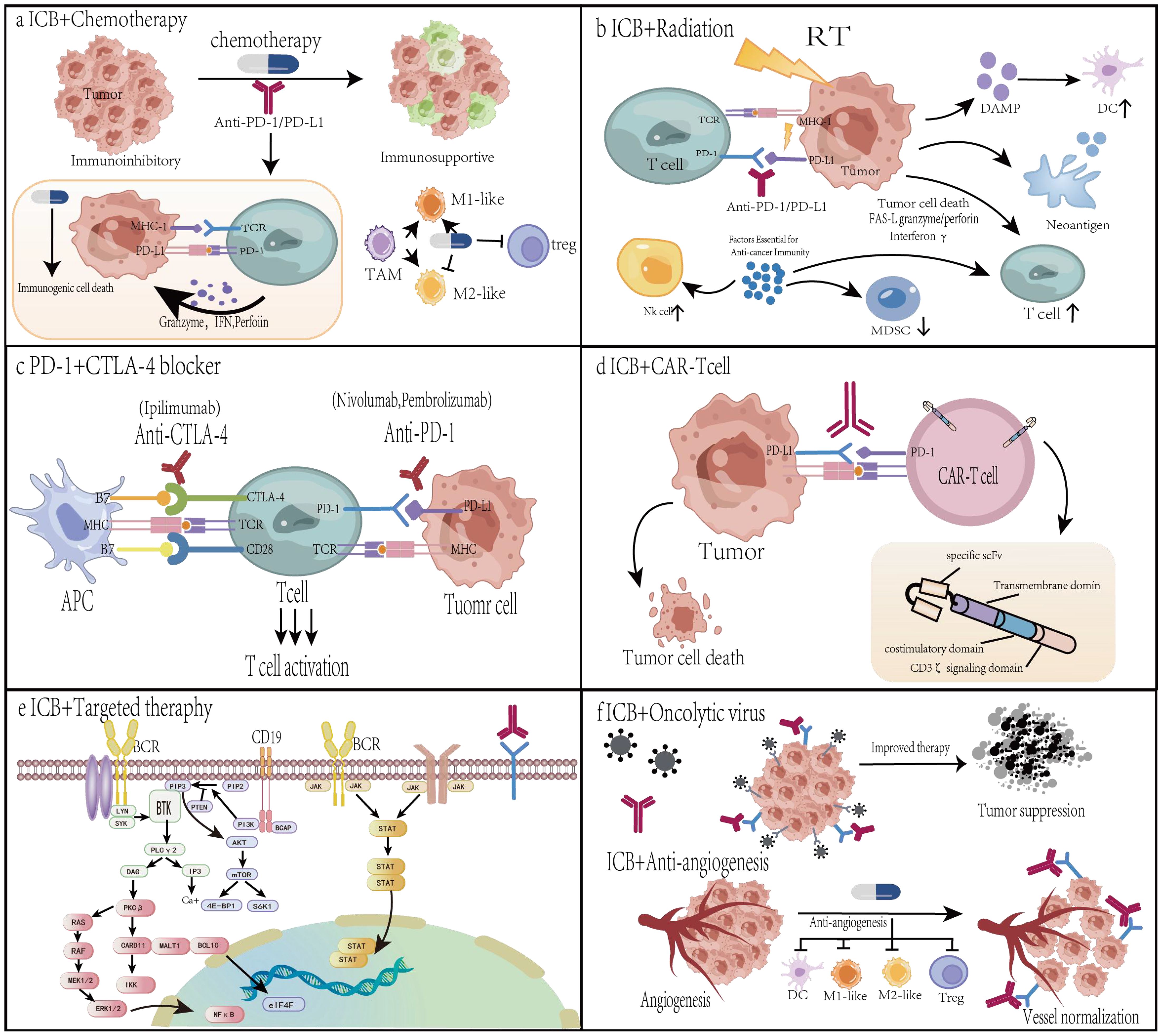 Figure 2. The mechanisms behind the synergistic anticancer effects of PD-1/PD-L1 in conjunction with chemotherapy, radiation, or angiogenesis inhibitors. (a) Combined with chemotherapy. Some cytotoxic chemotherapy drugs can cause immunogenic cell death and boost anti-tumor immunity. Immunogenic cell death is distinguished by a number of up-regulated damage-associated molecular patterns (DAMPs). I addition to immunogenic cell death, low-dose chemotherapy depletes regulatory T cells (Tregs) and promotes repolarization of tumor-associated macrophages (TAMs) from M2 to M1 phenotypes. (b) Radiotherapy enhances the effectiveness of α-PD-1/PD-L1 treatment. First, radiation causes immunogenic cell death, boosts anti-tumor immune responses, encourages T-cell infiltration, and increases the T-cell receptor (TCR) pool in the tumor microenvironment. Radiotherapy increases the expression of PD-L1 on tumor cells, which can be used to target more α-PD-1/PD-L1. (c) Combination therapy with PD-1 and CTLA-4 blockers. Antibodies against PD-1/PD-L1 and CTLA-4 can inhibit their activation, respectively. A combination of PD-1 and CTLA-4 inhibitors may have a synergistic impact. (d) Combination with CAR-T. Collection of blood and isolation of leukocytes via leukapheresis, genetic alteration of T cells, multiplication of the resulting modified CAR-T cells, injection of CAR-T cells, and mAb inhibition of inhibitory signaling pathways to improve therapeutic efficacy. (e) In combination with targeted therapy. Oncogenic pathways, such as MAPK and PI3K-AKT, stimulate PD-L1 transcription. Targeted therapies such as EGFR-TKI, ALK-TKI, and RAS inhibitors not only directly limit tumor growth but also lower intrinsic PD-L1 levels. (f) In conjunction with oncolytic viruses or angiogenesis inhibitors. When infected with oncolytic viruses, tumor cells launch an antiviral response by generating antiviral cytokines. Lysis of tumor cells results in the release of viral progeny, damage-associated molecular patterns, pathogen-associated molecular patterns, and tumor-associated antigens. Viral offspring infect more tumor cells. Angiogenesis inhibitors suppress pro-angiogenic pathways, promote vascular normalization, increase tumor perfusion and oxygenation, treat hypoxic TME, and improve medication delivery.