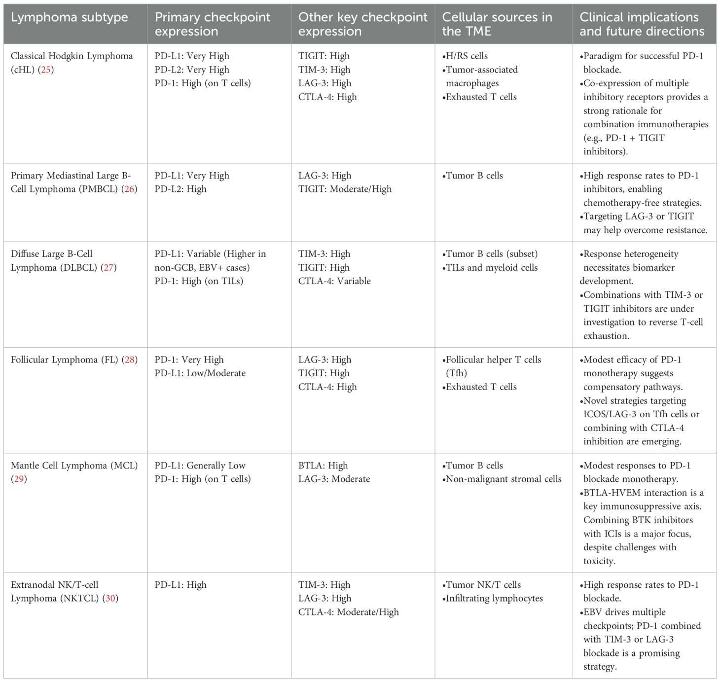 PD-L1 and PD-L2 are frequently overexpressed by malignant lymphoma cells to protect against activated intratumoral T cells. We summarized the immune checkpoint expression profiles of different lymphocyte subtypes, as shown in Table 1. Monoclonal antibodies targeting PD-1 can remove the inhibitory signals sent to T cells, thereby reactivating intratumoral T cells that target malignant clones. However, the therapeutic benefit of PD-1 blockade varies among different lymphoma subtypes. For instance, HL has shown durable responses to anti-PD-1 antibodies (31–33), whereas other lymphoma subtypes, such as small lymphocytic lymphoma (SLL), peripheral T-cell lymphoma (PTCL), follicular lymphoma (FL), and diffuse large B-cell lymphoma (DLBCL), have demonstrated limited therapeutic efficacy from PD-1 blockade (34).