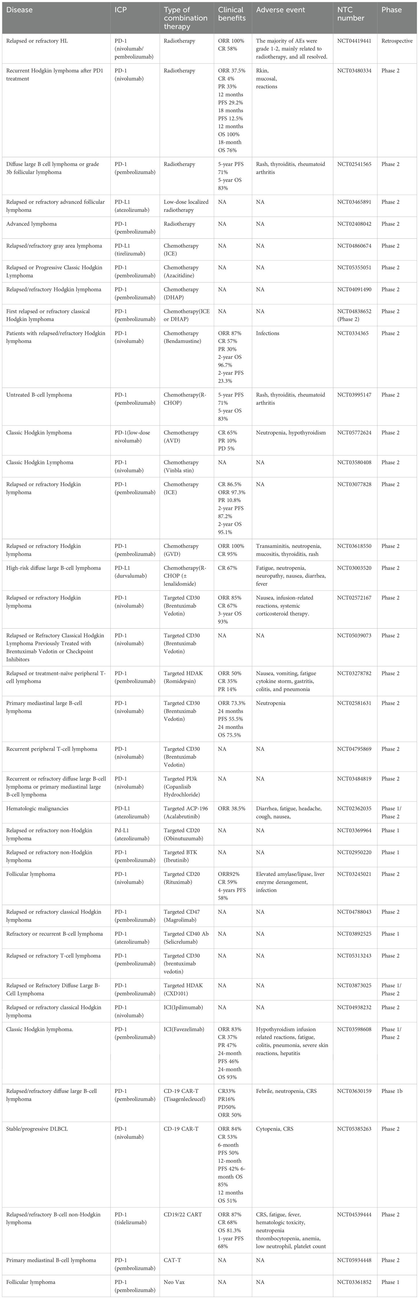 The combination of immune checkpoint inhibitors and chemotherapy has emerged as a promising therapeutic strategy in the treatment of lymphomas. ICIs, such as anti-PD-1 and anti-CTLA-4 antibodies, have demonstrated significant efficacy in enhancing anti-tumor immune responses by blocking inhibitory signals that suppress T cell activation. However, the response rates to ICIs alone are often limited in certain types of lymphomas. The integration of these two modalities leverages the tumor-shrinking effects of chemotherapy to enhance the efficacy of ICIs, while ICIs can augment the immune system ability to recognize and eliminate residual cancer cells. This synergistic approach has shown encouraging results in clinical trials, with improved overall response rates and progression-free survival in patients with relapsed or refractory lymphomas (Table 2).
