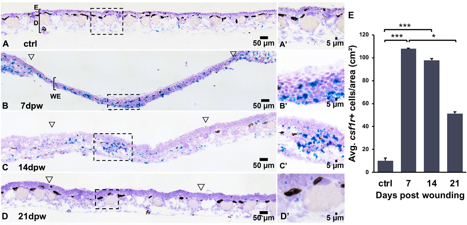 Figure 2. Csf1r+ macrophages accumulate transiently during wound repair. (A–D′) RNA in situ hybridization detecting csf1r+ cells (teal) in (A, A′) unwounded skin and at (B, B′) 7, (C, C′) 14 and (D, D′) 21 days post wounding (dpw). Open arrowheads mark wound edges, boxed regions indicate higher magnification in A′–D′. (E) Quantification of csf1r+ cell density (cells/cm²). Data are mean ± SEM (n = 4-5 biological replicates per group). One-way ANOVA with Tukey’s post hoc test; *p < 0.05, ***p < 0.001.
