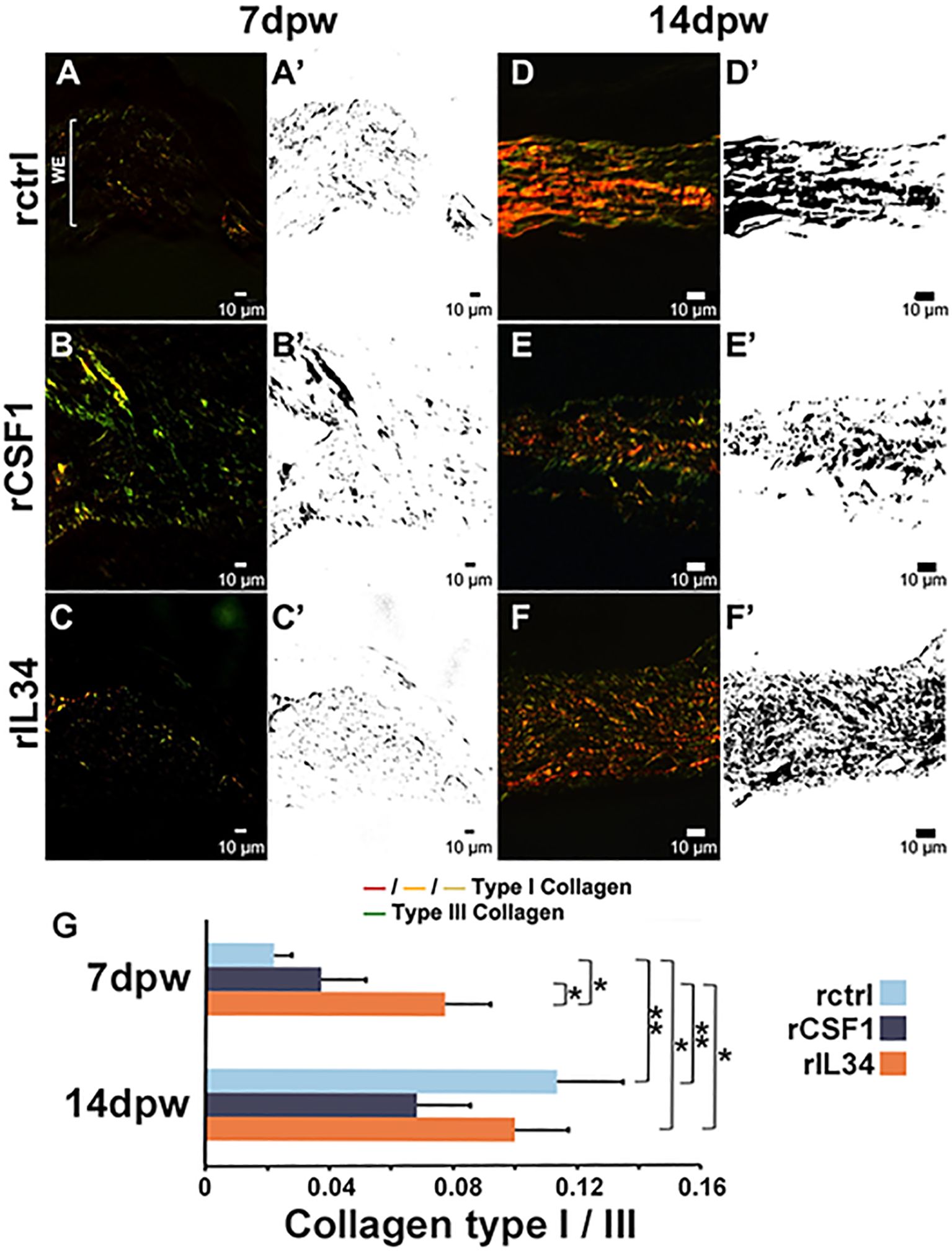 Figure 6. Collagen I and III deposition in rCSF1- and rIL34-administered wounds. (A–C′) Picrosirius red (PSR) staining of (A, A′) rctrl, (B, B′) rCSF1, and (C, C′) rIL34-administered wounds at 7 days post wound (dpw; cytokines administered 3 dpw), imaged with polarized light microscopy. Collagen I (red/orange/yellow) and collagen III (green) birefringence is shown; corresponding binary masks are in A′–C′. (D–F′) PSR staining of (D, D′) rctrl, (E, E′) rCSF1, and (F, F′) rIL34 wounds at 14 dpw with corresponding masks (D′–F′). (G) Quantification of collagen I/III ratios at 7 and 14 dpw. Data represent mean ± SEM (n = 7-12 biological replicates per group). One-way ANOVA with Tukey’s post hoc test; *p < 0.05, **p < 0.01.