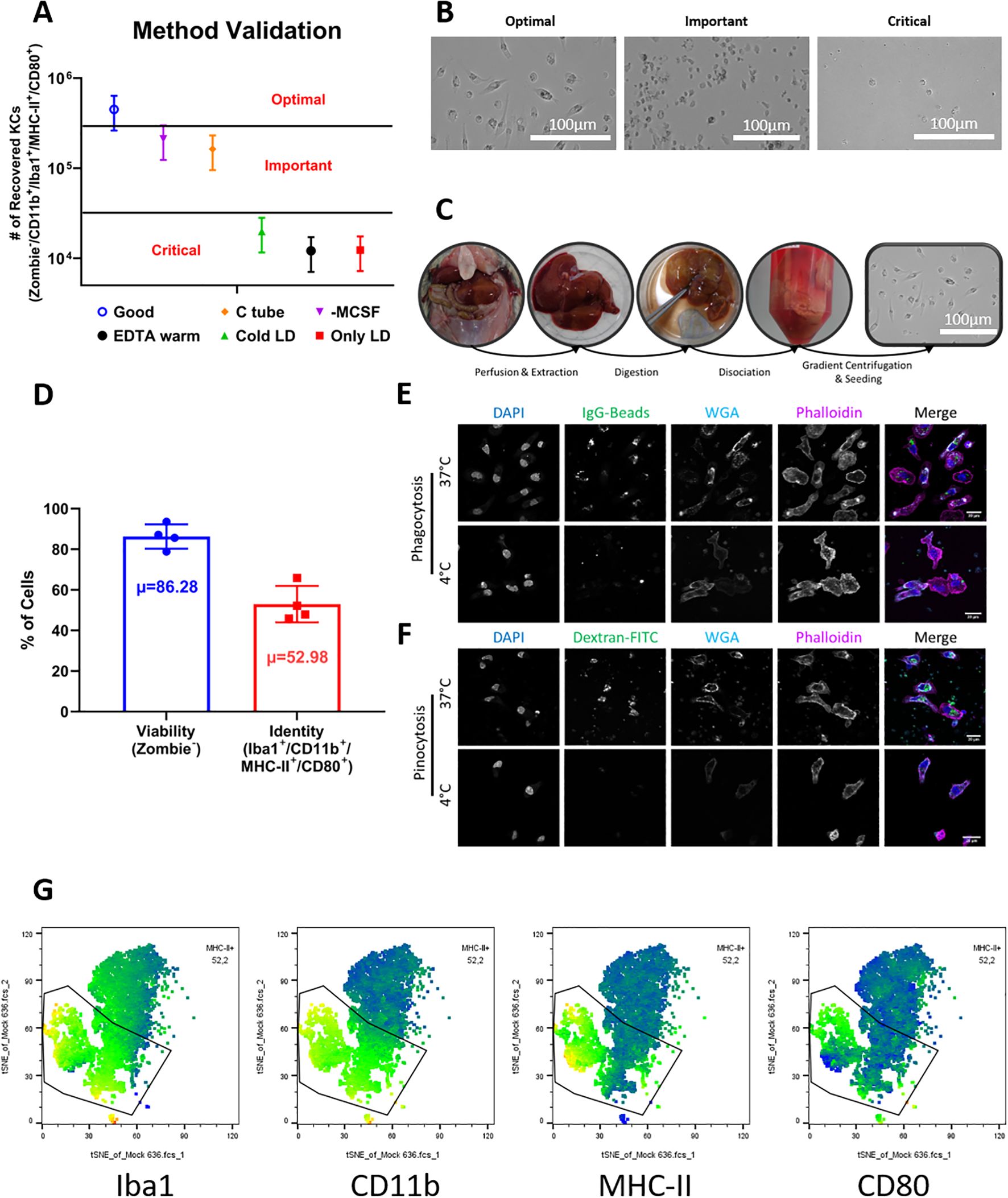 Figure 1. Optimization, validation, and characterization of Kupffer cell isolation from natal multimammate mice. (A) Yield of Kupffer cells obtained under different protocol conditions. Cell numbers were determined by flow cytometry with counting beads. Bars represent mean ± SD from four biological replicates for the optimized protocol. To adhere to 3R principles and avoid unnecessary animal use, the other experimental conditions were tested in single animals; their error ranges were extrapolated using the coefficient of variation (CV) derived from the optimized group to illustrate data dispersion, but were not included in statistical analyses. (B) Brightfield microscopy illustrating Kupffer cell morphology under different conditions. Under optimal conditions, cells appeared abundant and displayed the characteristic spread macrophage-like morphology; under “important” conditions, yields were reduced but adherent cells retained typical morphology; under “critical” conditions, cells were sparse and showed poor adherence or abnormal shape. (C) Documentation of the main protocol steps, showing macroscopic changes in liver tissue during perfusion, digestion, dissociation, and seeding. (D) Flow cytometry analysis of cell viability (Zombie-) and Kupffer cell phenotype (Iba1+/CD11b+/MHC-II+/CD80+) among viable cells. Data shown as mean ± SD from four animals; µ indicates the average marker frequency. (E) Phagocytic activity of isolated Kupffer cells assessed by confocal microscopy using fluorescent IgG-coated particles. Uptake is shown for cells incubated at 37 °C or at 4 °C as negative control. (F) Pinocytic activity assessed using fluorescent dextran under the same temperature conditions. Confocal images are representative of three independent experiments. Cell nuclei were stained with DAPI (blue), membranes with WGA (cyan), and actin cytoskeleton with phalloidin (magenta). Merged images were processed using ImageJ. (G) Representative tSNE plots from flow cytometric analysis. Each plot displays the mean fluorescence intensity (MFI) of a single marker, with the Kupffer cell population (Iba1+/CD11b+/MHC-II+/CD80+) highlighted.