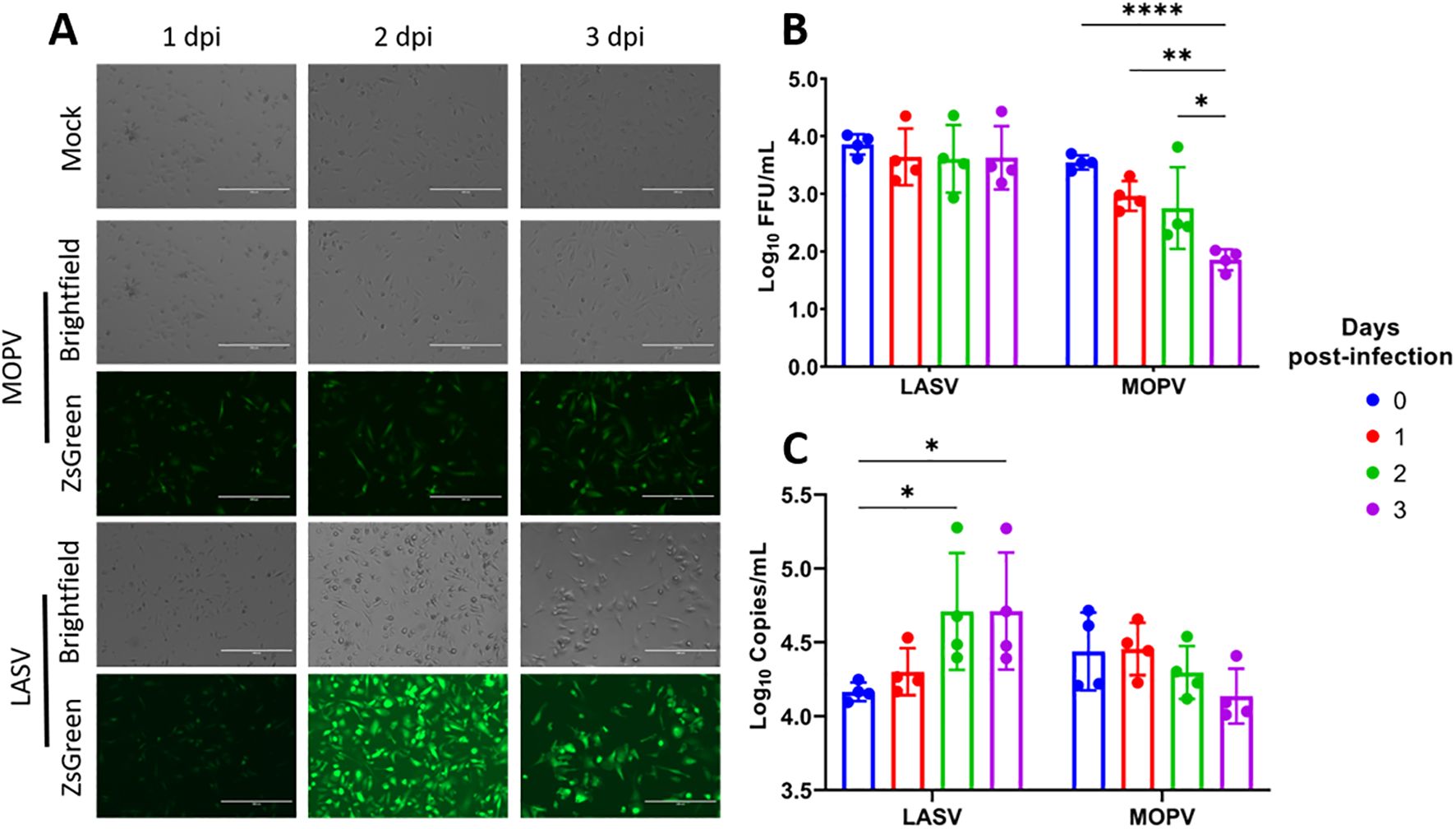 Figure 2. Kupffer cells from the natal multimammate mice support infection by LASV and MOPV. (A) Representative brightfield and fluorescence microscopy images of Kupffer cells infected with Mock, MOPV-ZsGreen or LASV-ZsGreen from 1-3dpi. (B) Virus quantitation in the supernatant from LASV- and MOPV-infected cells measured by focus-forming assay from day 0–3 dpi. (C) Viral RNA levels in the supernatant quantified by RT-qPCR for LASV and MOPV from day 0–3 dpi. Statistical analysis was performed using two-way ANOVA with Dunnett’s post hoc test. ****p<0.0001; **p<0.01; *p<0.05. The scale bar on the microscopy pictures represent 200μm.