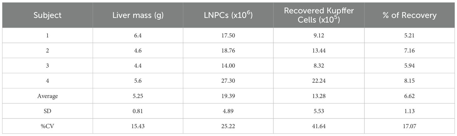 Using this optimized protocol, we consistently obtained 1.43-3.97 × 105 Kupffer cells per gram of liver tissue, with an average yield of 2.55 ± 1.13 × 105 cells/g (N = 4). These values were derived from livers ranging from 4.4 to 6.4g in mass (Table 1). Cell viability was approximately 80%, assessed by dye exclusion the day after isolation (Figure 1D), indicating minimal cytotoxicity during preparation. The adherent cells displayed a consistent macrophage-like morphology across all animals and replicates, with flattened, spread-out shapes indicative of resting macrophages (Figure 1C, rightmost image).
