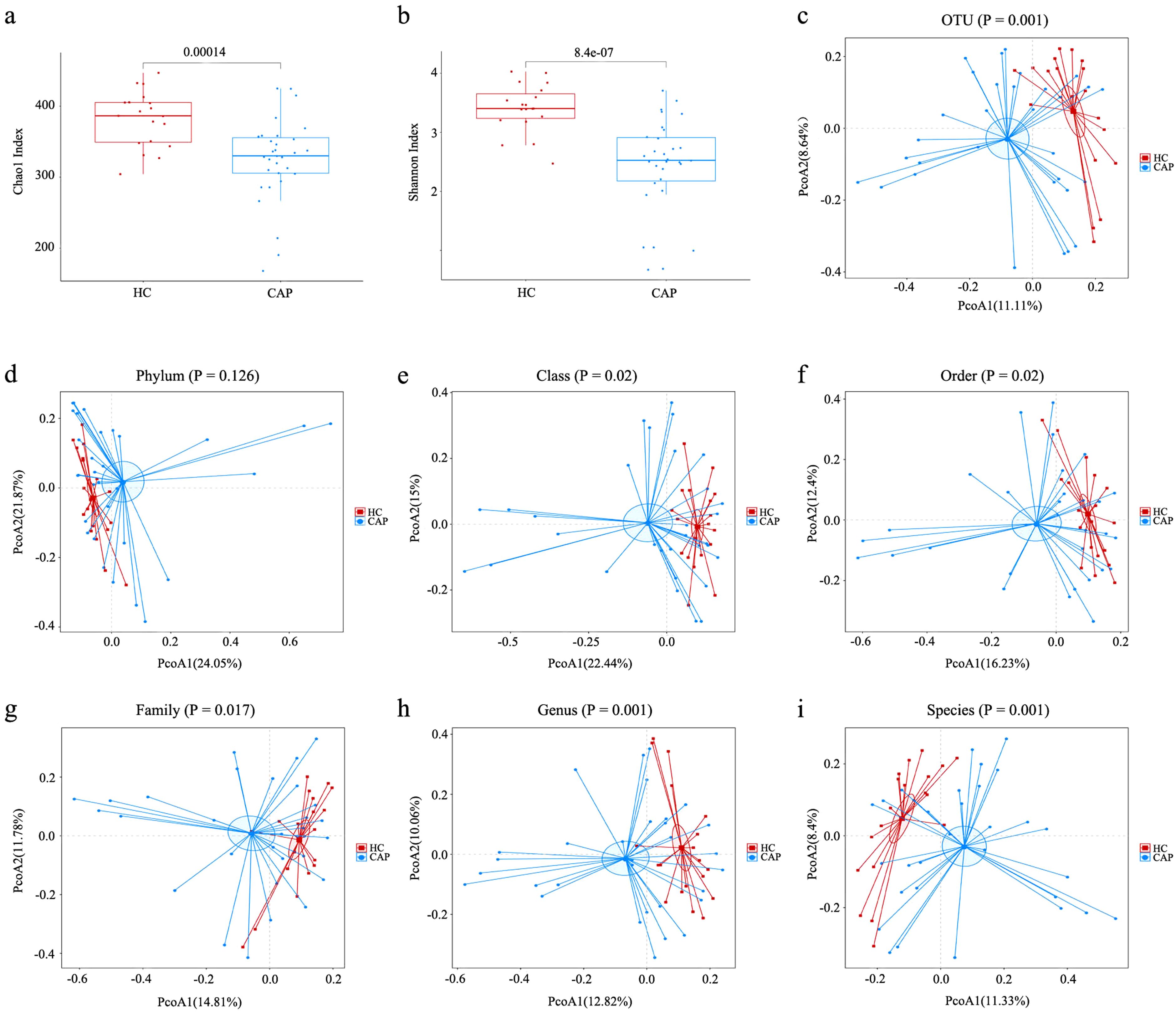 Figure 1. Analysis of alpha- and beta-diversities of gut microbiota between CAP patients and healthy controls. (a) Chao1 index; (b) Shannon index; Based on the Bray-Curtis algorithm, the principal coordinate analysis (PCoA) of gut microbiota was carried out at the level of OTU (c), phylum (d), class (e), order (f), family (g), genus (h) and species (i). n = 31 for the CAP patients and n = 19 for the HC group.