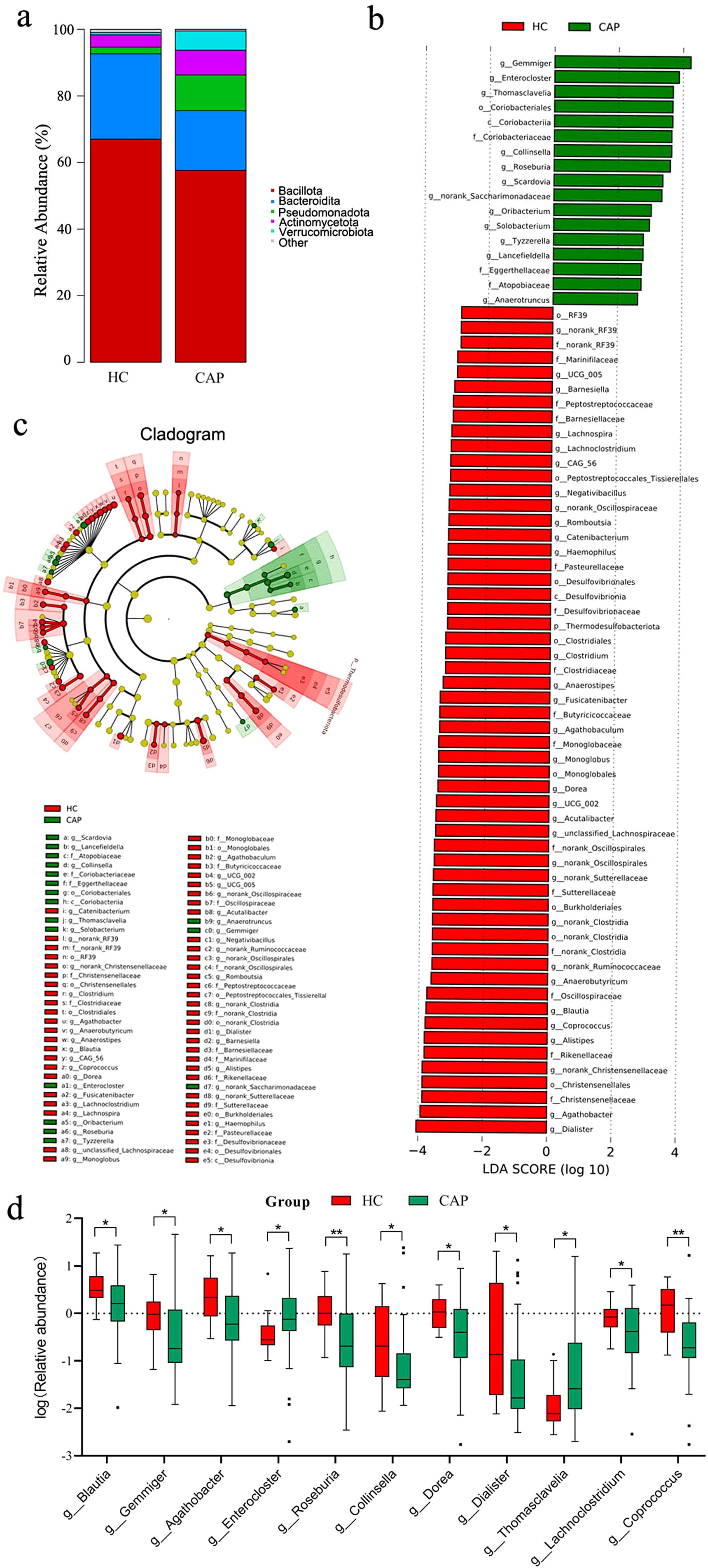 Figure 2. Changes in gut microbiota of CAP patients. (a) Relative abundance of gut microbial communities at the phylum level in the HC group and CAP patients; (b) LEfSe analysis of differential abundance. The figure shows the linear discriminant analysis (LDA) scores (log10) of major genera: positive scores represent genera with higher abundance in the CAP group, while negative scores represent genera with higher abundance in the HC group; (c) Phylogenetic tree. The tree structure reflects the hierarchical distribution of bacteria from phylum to genus, with taxa showing significant differences in abundance marked by colors; (d) Displaying the log-transformed relative abundance of genera with significant differences among the top 30 most abundant genera in CAP patients, compared with the healthy control group. *p < 0.05, **p < 0.01. n = 31 for the CAP patients and n = 19 for the HC group.
