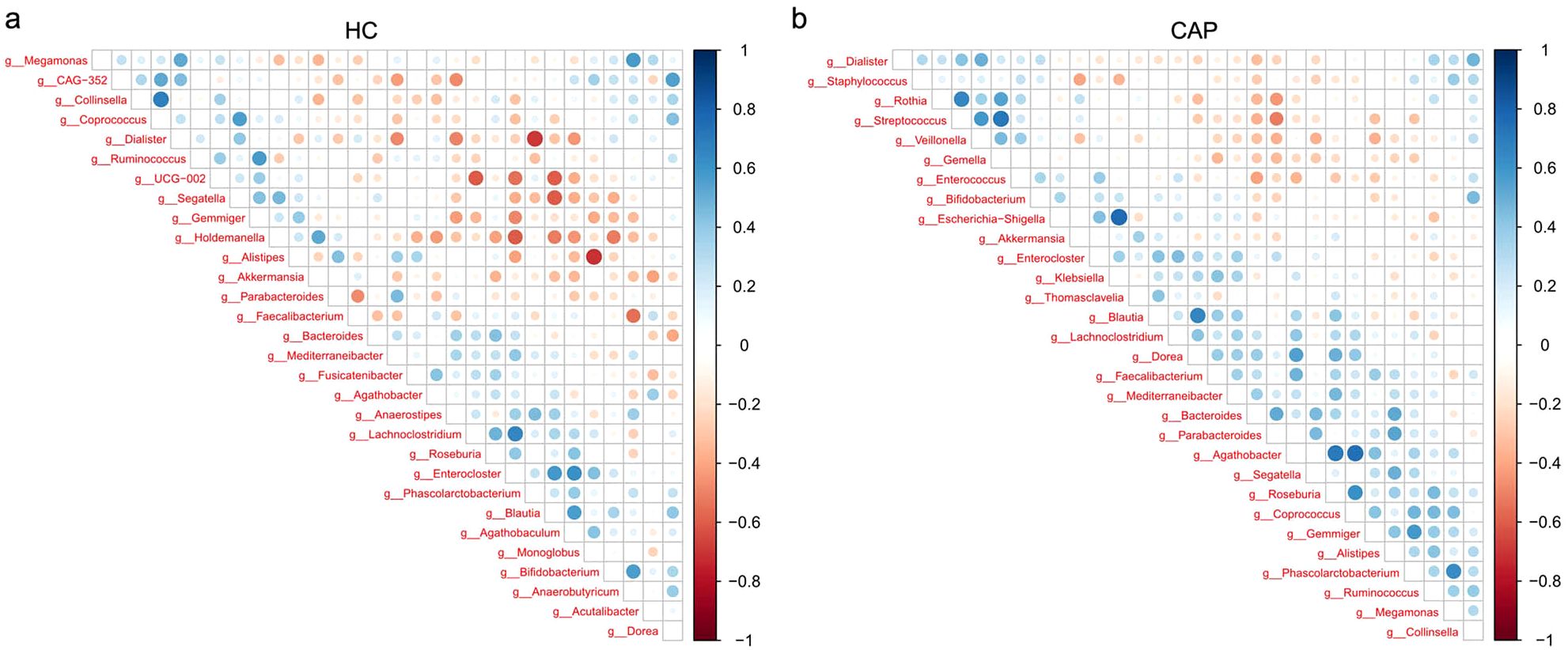 Figure 3. Correlations between gut microbial genera in CAP patients and healthy controls. Correlation heatmap of gut microbial genera in the HC group (a) and CAP patients (b). The intensity of the color indicates the strength of the correlation, with blue representing a positive correlation and red representing a negative correlation. n = 31 for the CAP patients and n = 19 for the HC group.