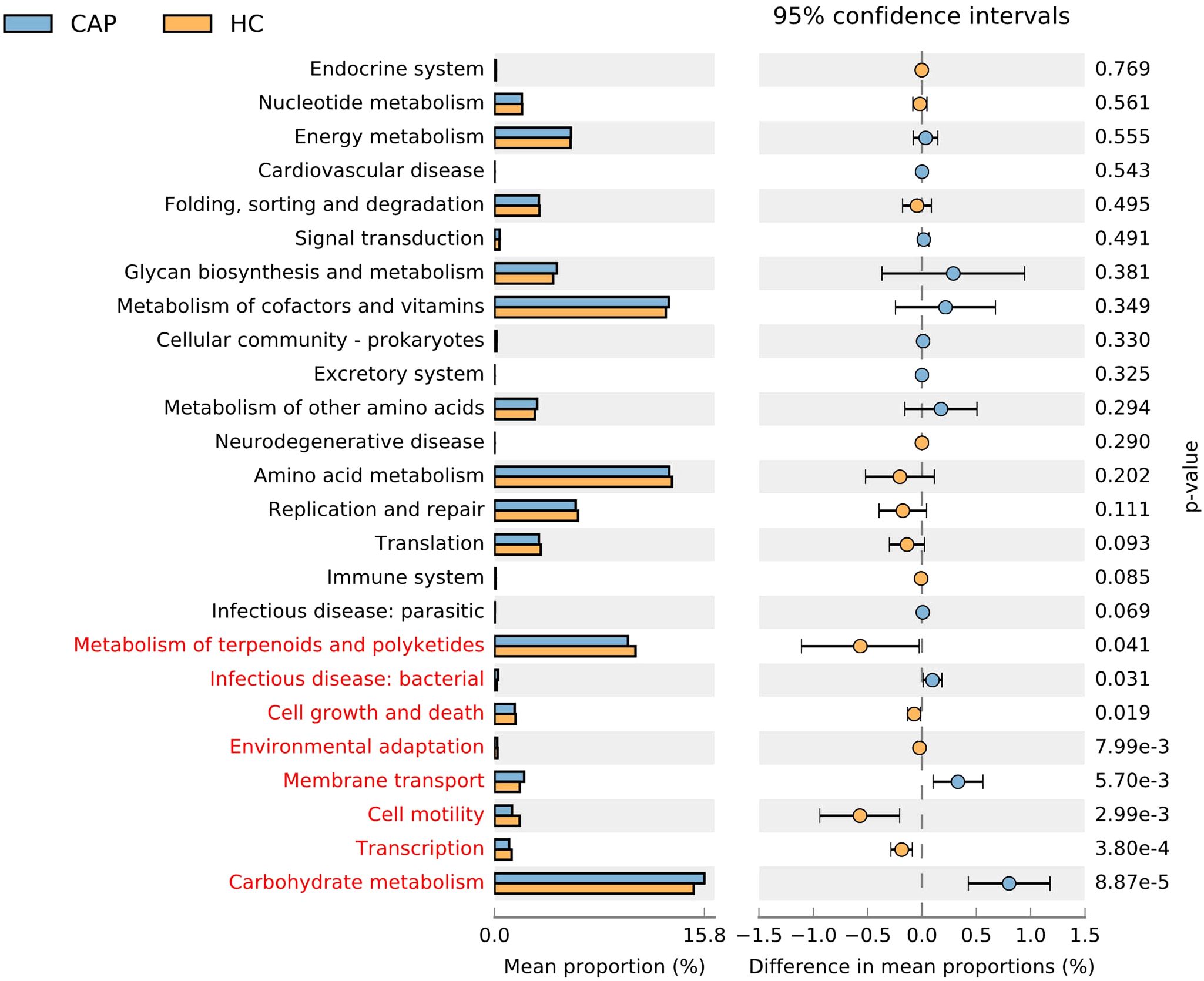 Figure 4. Extended error bar plot and dot plot analysis of PICRUSt-predicted KEGG pathway functions of gut microbiota in CAP patients and healthy controls. Bar plots on the left display the mean proportion of each KEGG pathway, while dot plots on the right show the differences in mean proportions between the two groups of samples using P-values. For LEfSe analysis, a logarithmic LDA score threshold > 2.0 and values of p < 0.05 were considered statistically significant. n = 31 for the CAP patients and n = 19 for the HC group.