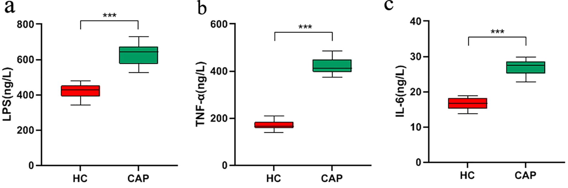 Figure 5. Analysis of inflammation in CAP patients. The expression levels of LPS (a), TNF-α (b), IL-6 (c) in the serum of CAP patients and healthy controls were measured by ELISA. ***p < 0.001. n = 31 for the CAP patients and n = 19 for the HC group.