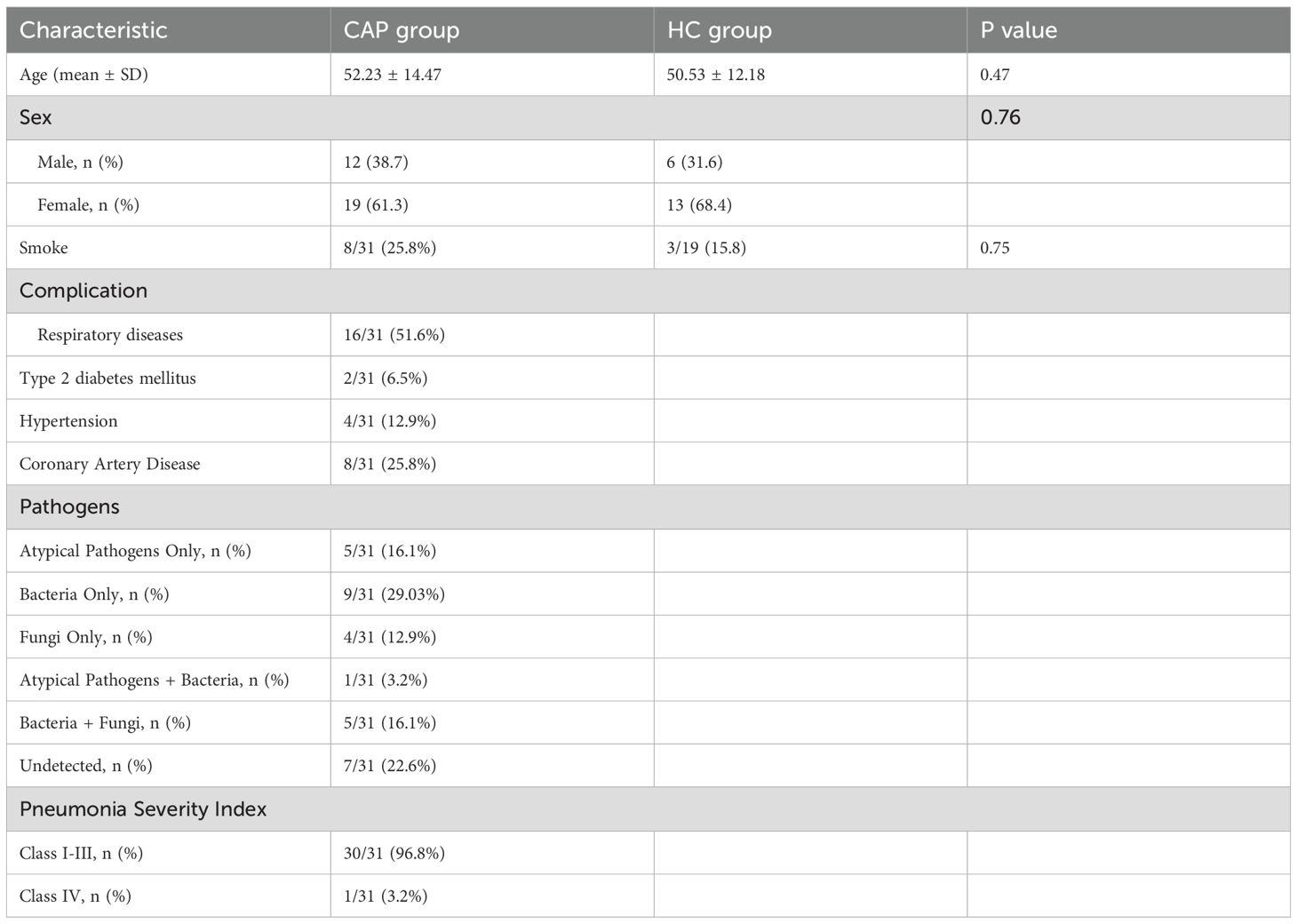 In this study, a total of 31 CAP patients and 19 healthy controls were recruited. Table 1 summarizes the age, sex, smoking history, complications, pathogenic bacteria, and pneumonia severity index of all participants. Pathogenic detection results were positive in 24 patients (77.4%). Among them, only bacterial infection (including Streptococcus pneumoniae, Haemophilus influenzae, Pseudomonas aeruginosa, etc.) accounted for the highest proportion (29.03%), followed by atypical pathogen infection (mainly mycoplasma pneumoniae, 16.1%), and fungal infection only accounted for 12.9%. One patient (3.2%) was diagnosed with co-infection of Mycoplasma pneumoniae and bacteria, and 5 patients (16.1%) were diagnosed with concurrent bacterial and fungal infections.