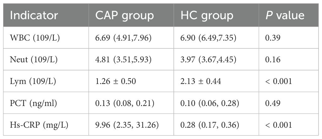 The counts of white blood cells (WBC), neutrophils (Neut), and lymphocytes (Lym), as well as the levels of procalcitonin (PCT) and high-sensitivity C-reactive protein (hs-CRP), in patients at admission and healthy controls are all summarized in Table 2. The lymphocyte count of CAP group was significantly lower than that of HC group (p < 0.001), while the level of hs-CRP was significantly higher than that of HC group (p < 0.001). There were no significant differences in the other indexes between the two groups.