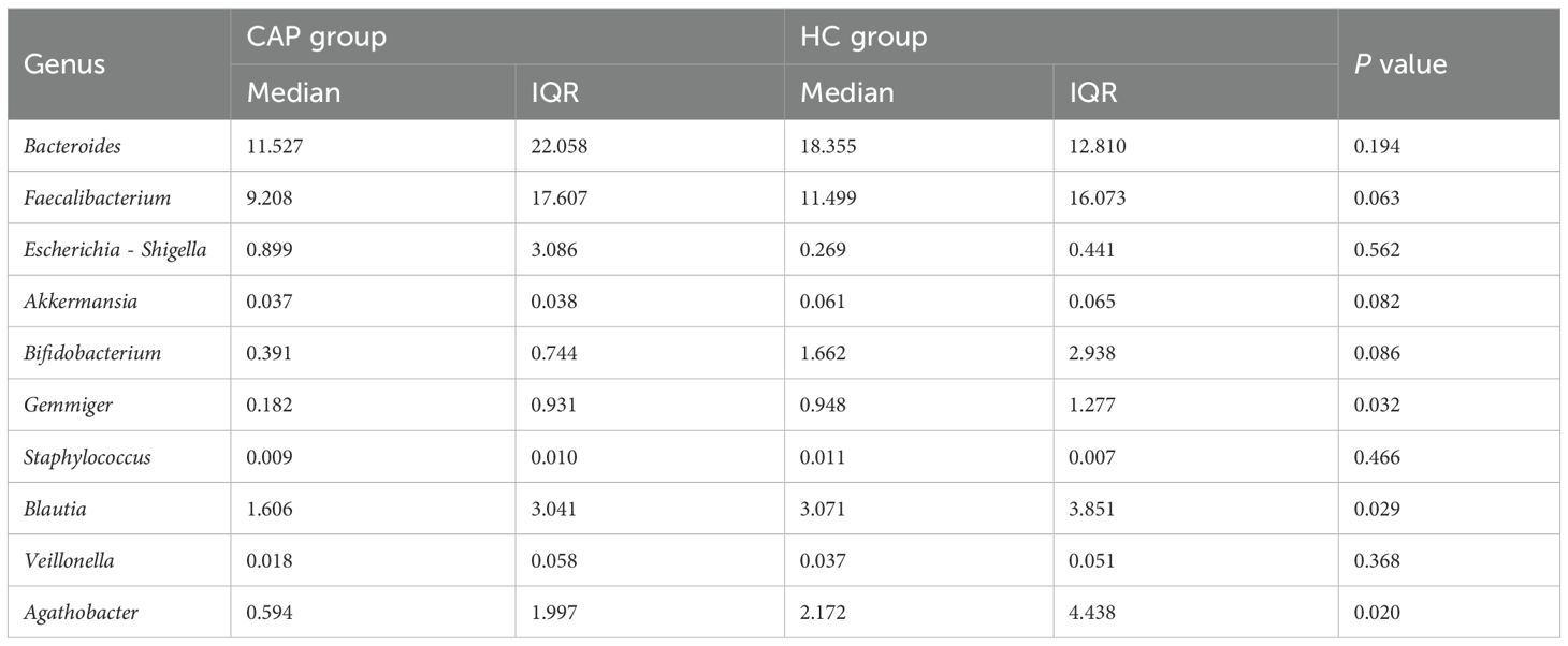 Analysis of the percentage of relative abundance at the phylum level showed no significant difference between the CAP group and the HC group (Figure 2a). At the phylum level, the four most abundant phyla in both groups were Firmicutes, Bacteroidetes, Proteobacteria, and Actinobacteria. The top 10 genera in the CAP group ranked by relative abundance are shown in Table 3. Compared with the HC group, there were significant differences among Blautia, Gemmiger and Agathobacter in the CAP group, but no significant differences were observed in the other genera.