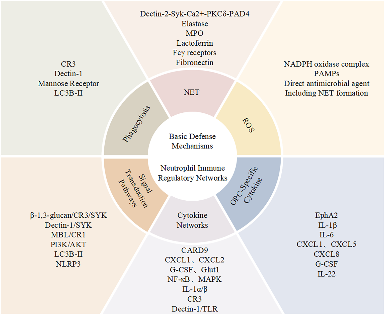 Neutrophil functional network in antifungal immunity. Schematic overview of neutrophil-mediated immune mechanisms during Candida infection, summarizing key molecular interactions, effector responses, and signaling pathways, together with a panel of OPC-related cytokines.