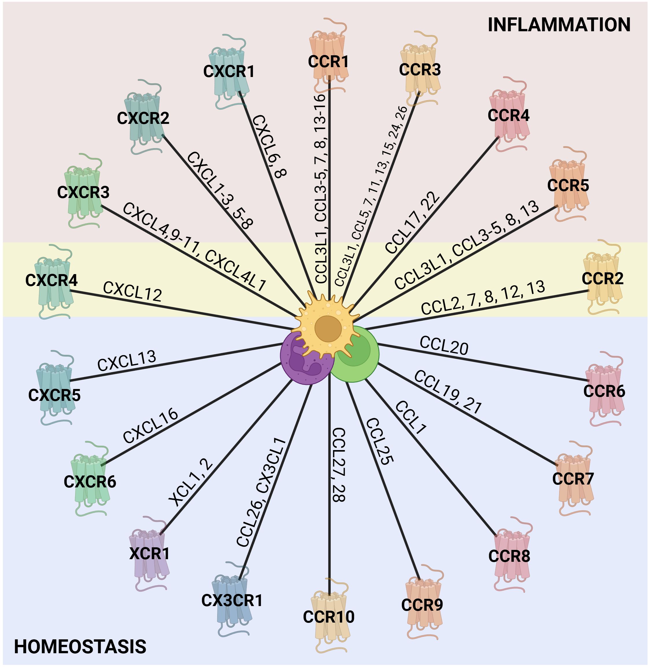 Figure 1. Chemokine receptors and their ligands. The outer ring of the wheel is composed of representations of the known chemokine receptors from each of the chemokine families (C, CC, CXC, and CX3C), with the chemokine agonists along the wheel spokes (39, 44, 45). The colors assigned to the receptors are arbitrary and serve to distinguish the families visually. Chemokine receptors are generally classified as either homeostatic or inflammatory based on their predominant roles. However, this distinction is not absolute, as their activity and function depend strongly on the cellular and inflammatory context. In the figure, receptors associated with inflammation are shaded in red, those linked to homeostasis in blue, and receptors with dual functionality in yellow. Notably, other inflammatory receptors may also contribute to homeostatic processes, given their role in tissue repair, although this remains to be further explored. In the center, there are some leukocytes that express chemokine receptors. Created in BioRender; Proost, P (2025).