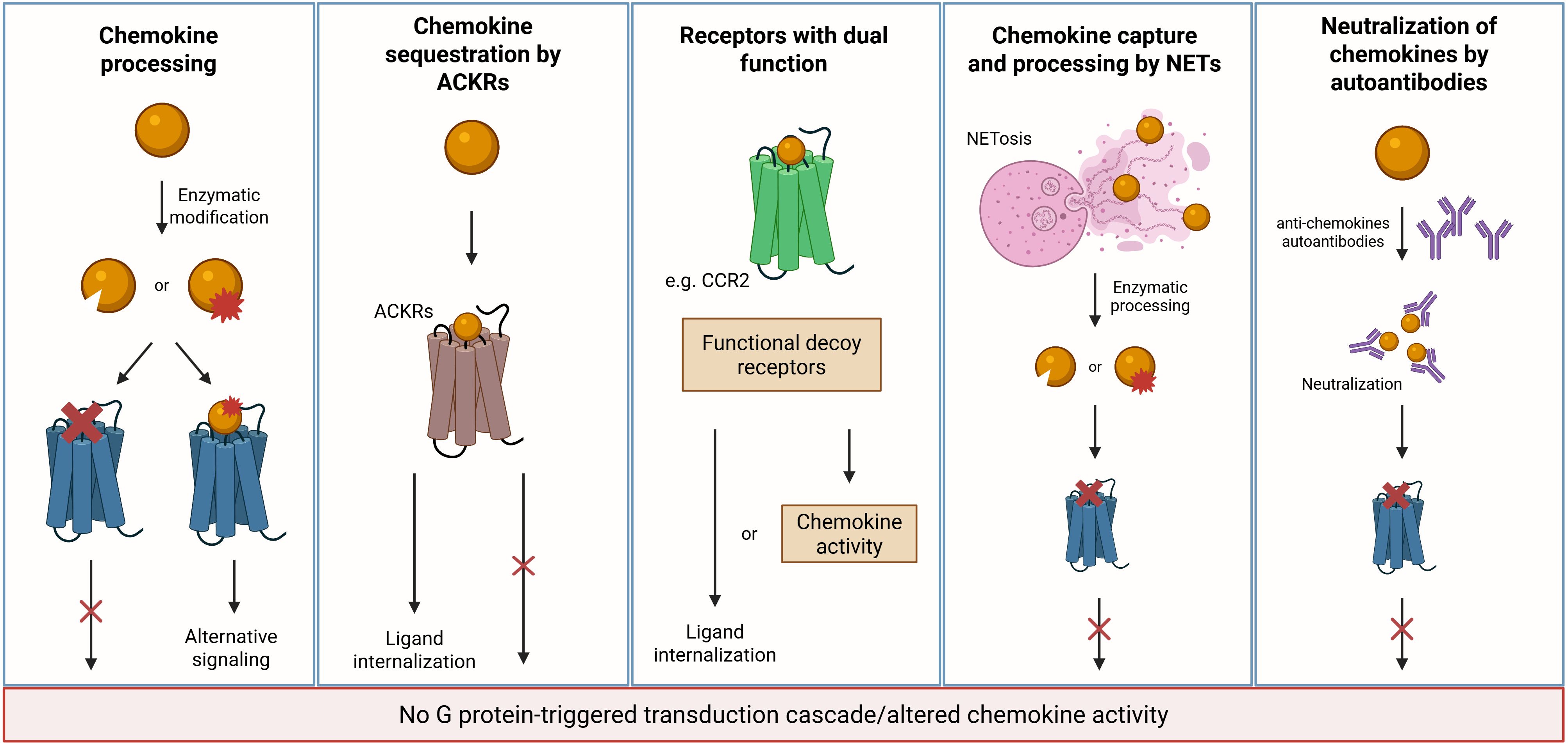 Chemokine receptors play a crucial role in regulating chemokine activity, and among them, atypical chemokine receptors (ACKRs) are especially important for fine-tuning chemokine availability. These seven-transmembrane spanning receptors differ from classical chemokine receptors in their broad ligand-binding profiles, and their inability to trigger conventional G protein-dependent signaling pathways (102, 103). Structurally and functionally diverse, the atypical chemokine receptor family includes five members: ACKR1, also called Duffy antigen receptor for chemokines (DARC); ACKR2, also called D6; ACKR3, also called CXCR7; ACKR4, previously called CCRL1 or Chemocentryx chemokine receptor (CCX-CKR); and ACKR5, also called GPR182 (36). These receptors have different roles and are mostly known to bind and constitutively internalize their ligands. Acting like decoy receptors, the ACKRs lack the DRY motif in the second intracellular loop, which is involved in coupling to G proteins and is essential to initiate these classical signaling cascades. While the receptor is recycled back to the plasma membrane, the ligand is directed toward lysosomal degradation. Notably, this internalization and recycling may occur independently of ligand presence. It is known that the absence of ACKRs leads to dysregulated accumulation of leukocytes and has different consequences (104, 105).