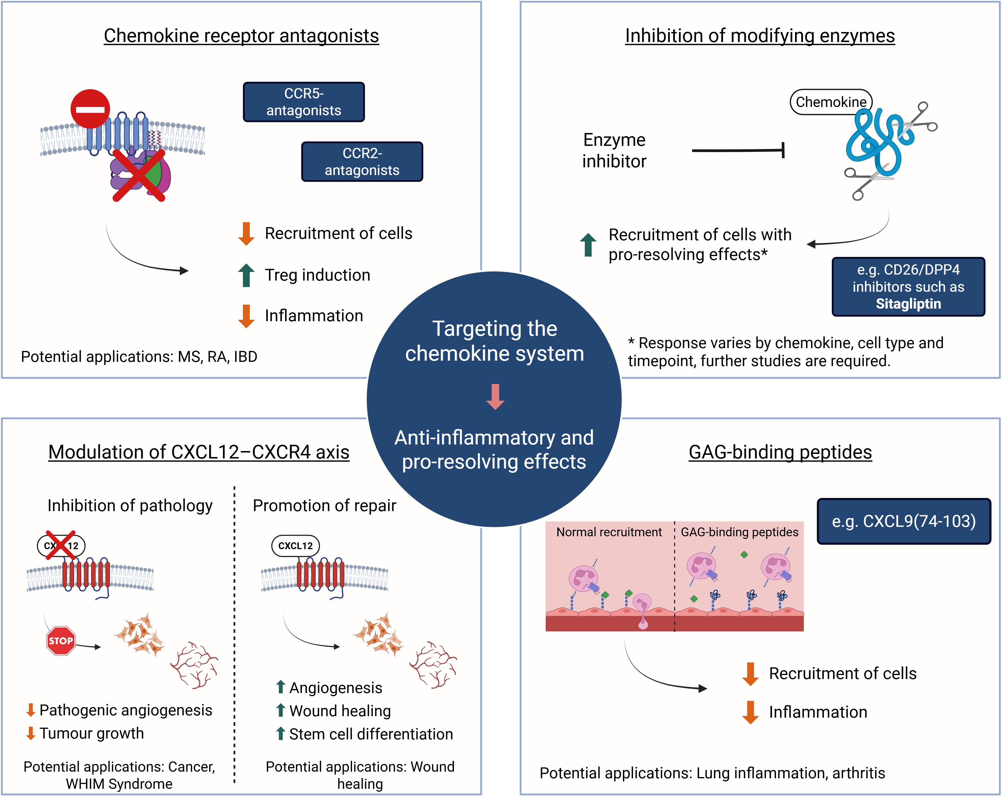 Figure 3. The chemokine system as a therapeutic target. Overview of current and emerging therapeutic strategies aimed at modulating chemokine activity. These include antagonizing chemokine receptors (e.g., CCR2, CCR5). Fine-tuning the CXCL12-CXCR4 axis may involve use of CXCR4 antagonists to reduce angiogenesis and tumor growth or to counteract gain-of-function mutations in WHIM syndrome. Alternatively, retaining CXCL12 signaling results in faster wound healing. Inhibiting the activity of chemokine modifying enzymes, such as DPP4/CD26, may stimulate recruitment of pro-resolving cells and disrupting interactions of inflammatory chemokines with GAGs through competition with potent GAG-binding peptides showed beneficial effects in preclinical models of lung and joint inflammation. Such interventions can modulate immune cell infiltration, promote inflammation resolution, and enhance tissue repair. The clinical outcomes of these strategies are highly context-dependent, varying with disease type, affected tissue, and timing of the intervention. Created in BioRender; Proost, P (2025).