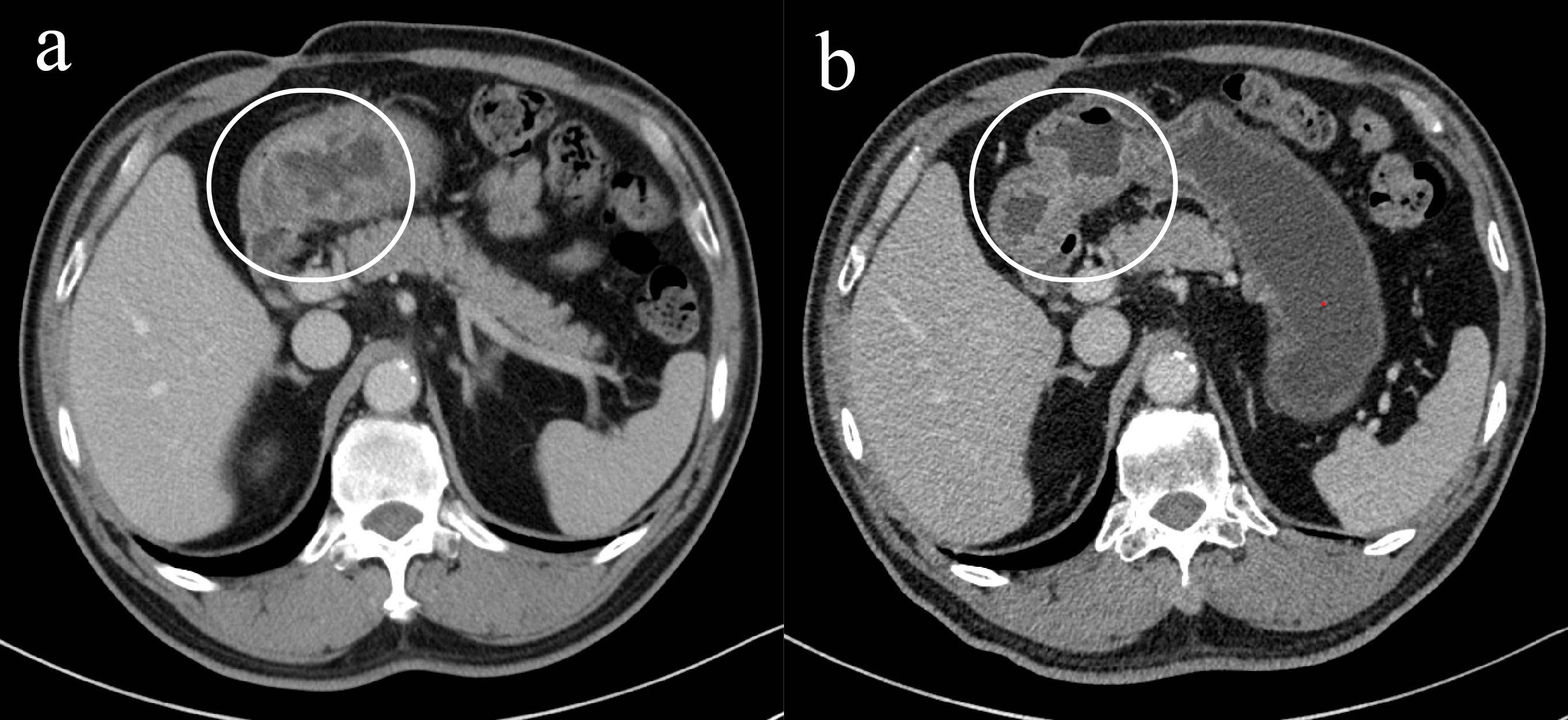 Figure 2. Imaging changes of gastric lesions after treatment, (a) On July 26, 2020 (slice thickness: 5mm, arterial phase), (b) On October 20, 2020 (slice thickness: 5mm, portal venous phase).