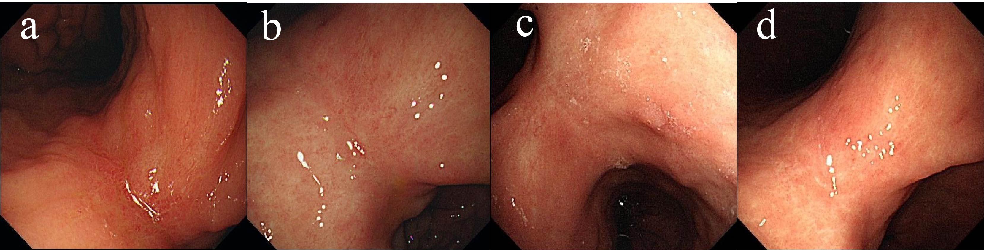 Figure 3. Changes of gastric lesions under gastroscopy, (a) On December 25, 2020, (b) On April 14, 2021, (c) On December 09, 2021, (d) On May 02, 2022.