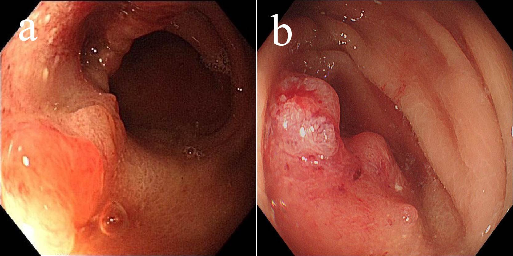 Figure 1. Changes of gastric lesions under gastroscopy, (a) On July 30, 2020, (b) On October 22, 2020.
