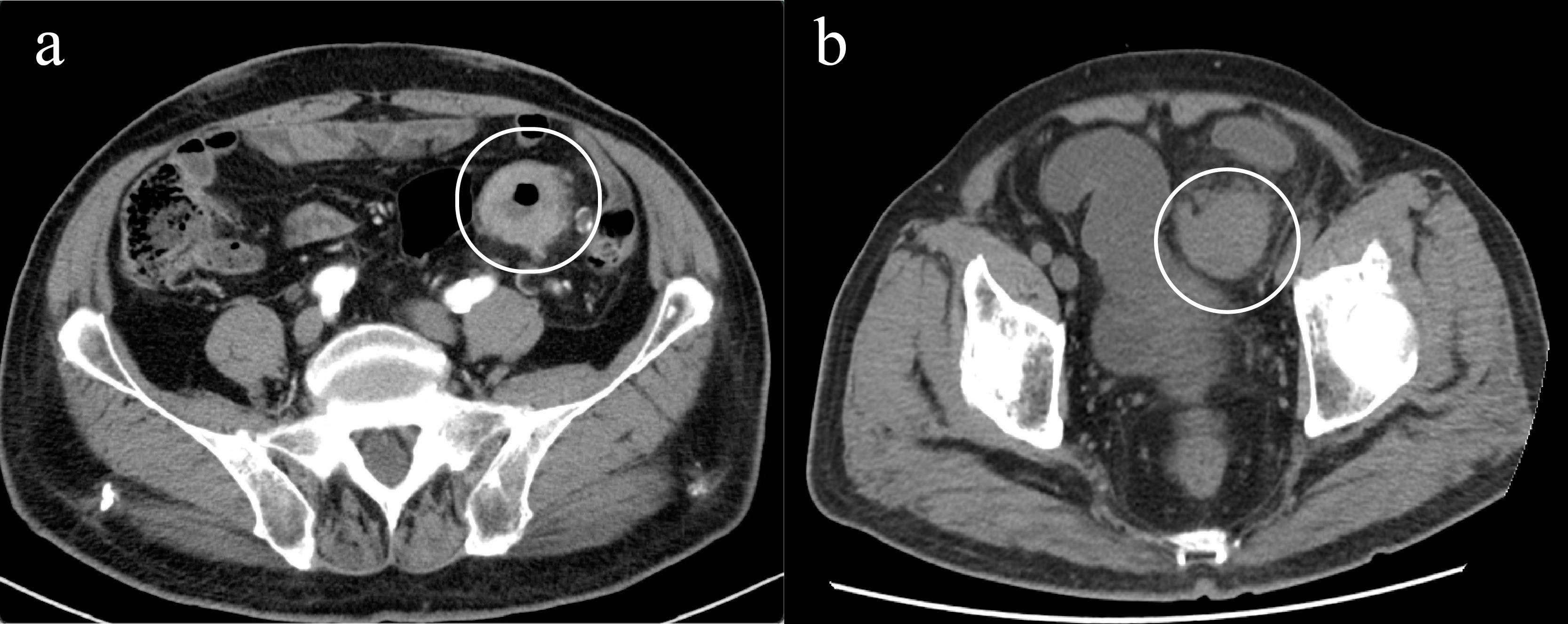 Figure 5. Imaging changes of colonic lesions, (a) On May 15, 2025 (slice thickness: 5mm, arterial phase), (b) On September 23, 2025 (slice thickness: 5mm, portal venous phase).