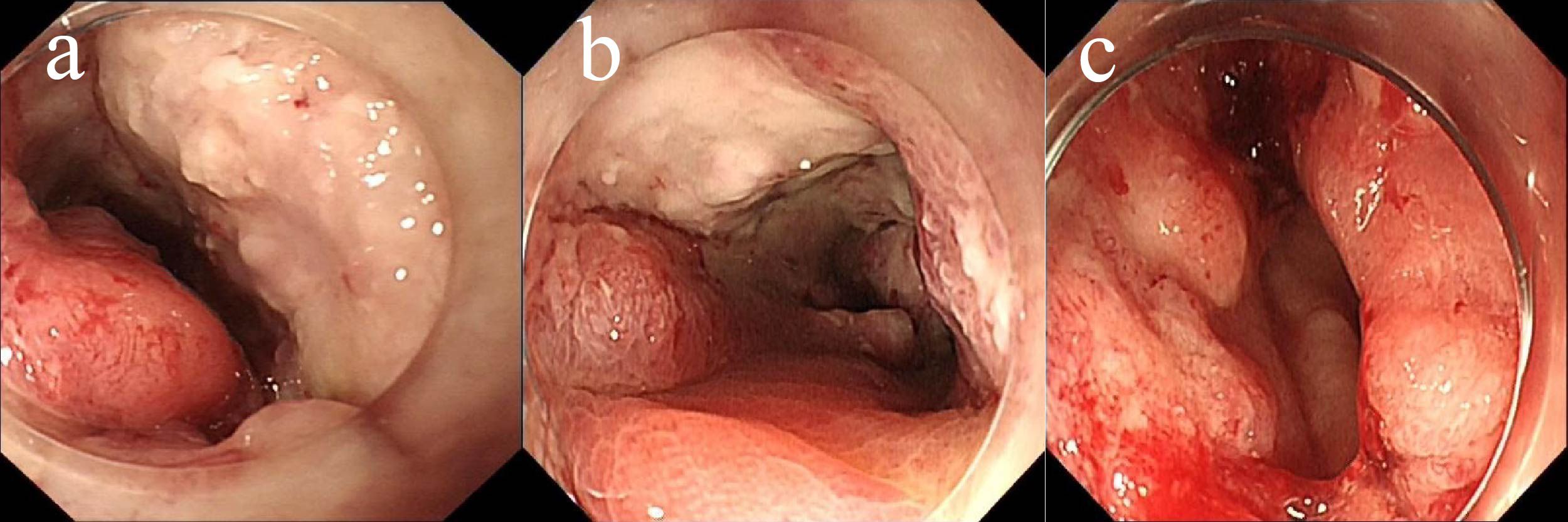 Figure 6. Endoscopic injection of colonic tumors, (a) On June 5, 2025, (b) On June 19, 2025, (c) On July 3, 2025.
