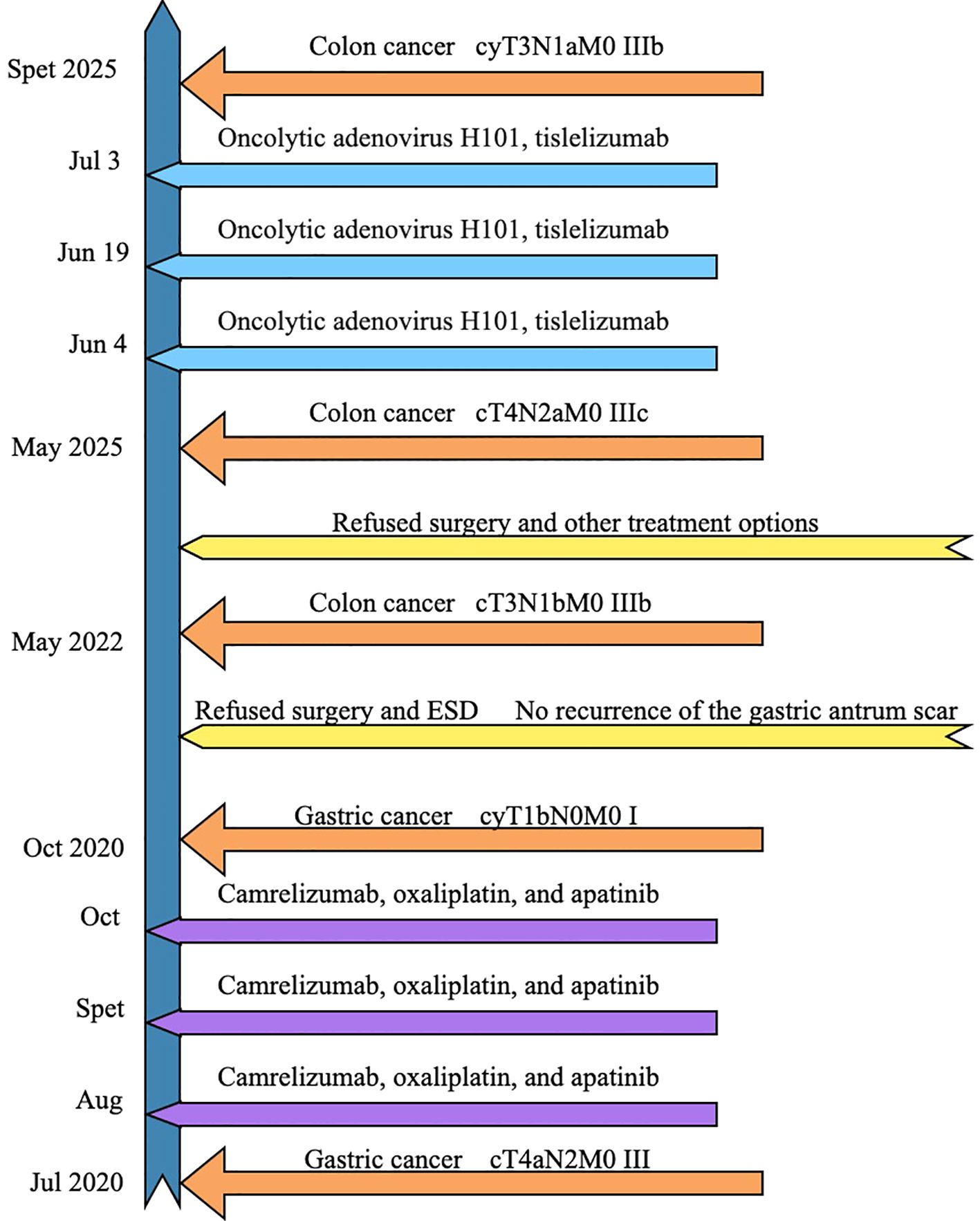 In conclusion, this case demonstrates that oncolytic virus endoscopic injection combined with immunotherapy can achieve significant therapeutic effects in an elderly patient with heterogeneous gastrointestinal malignant tumors. The treatment was associated with minimal adverse reactions and controllable safety, presenting a promising option for patients unable or unwilling to undergo surgery.