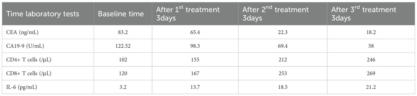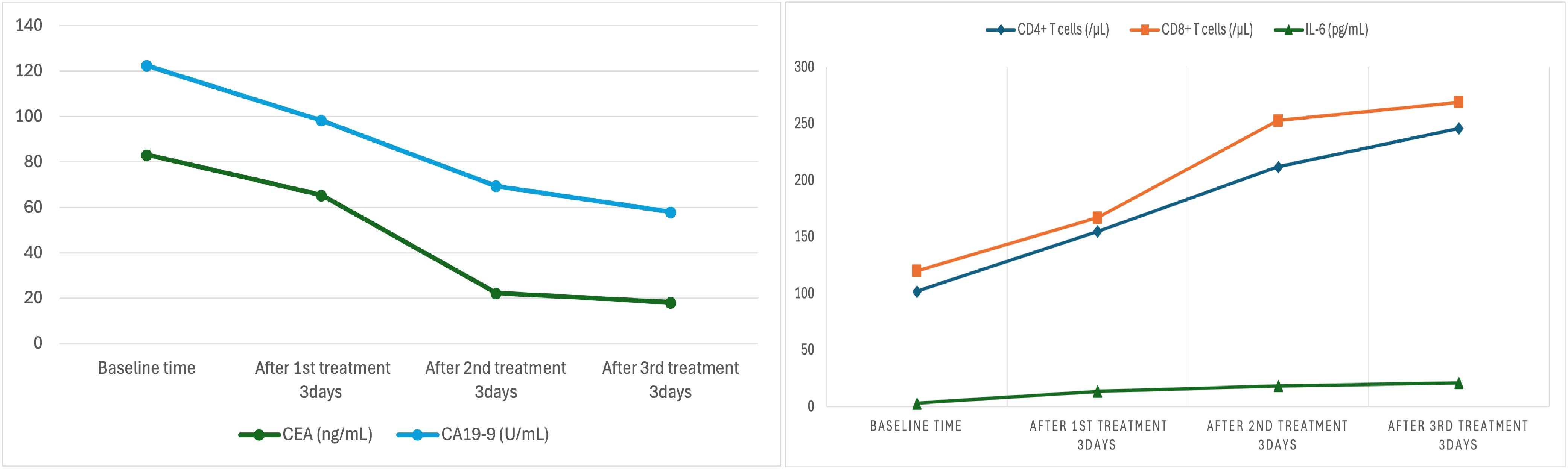 During treatment, the patient’s serum tumor markers significantly decreased: CEA decreased from 83.20 ng/mL to 18.2 ng/mL, and CA19–9 decreased from 122.62 U/mL to 58 U/mL. Immunological monitoring showed a significant increase in CD8+ T cells, from 102/μL to 246/μL, CD4++ T cells increased from 120/μL to 269/μL and interleukin-6 increased from 3.2 pg/mL to 21.2 pg/mL (Table 2) (Figure 9).