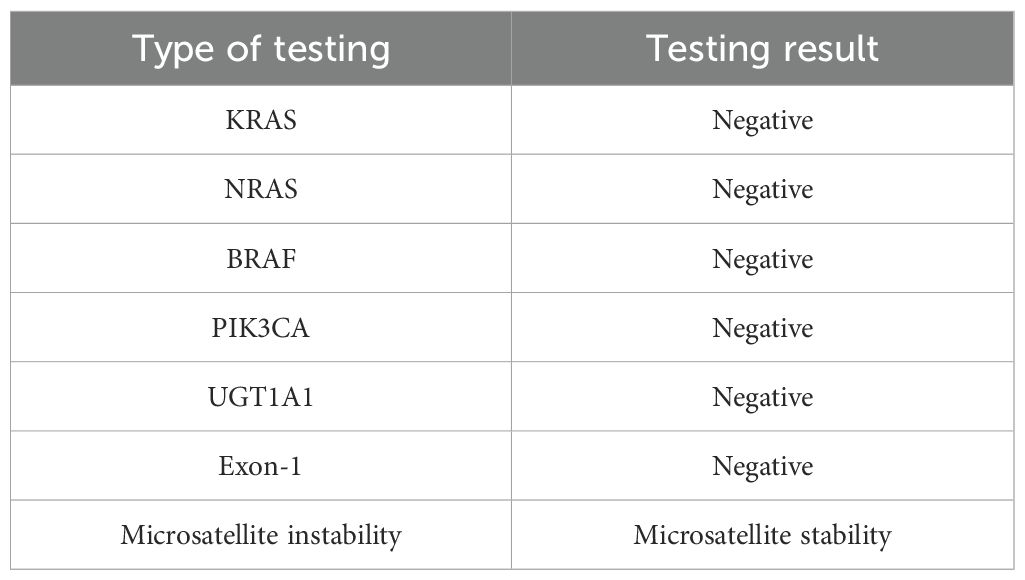 In May 2022, the patient presented with difficulty in defecation and abdominal bloating. Colonoscopy revealed an ulcerative neoplasm at the junction of the sigmoid and descending colon (Figure 4a), with pathological biopsy confirming adenocarcinoma. According to the AJCC staging criteria, the clinical stage was cT3N1bM0, stage IIIb. Genetic testing revealed wild-type KRAS, NRAS, BRAF, PIK3CA, and no mutations in the UGT1A1 promoter or Exon-1. Microsatellite stability was confirmed (Table 1), categorizing the tumor as a “cold tumor.” The patient requested non-surgical treatment and refrained from receiving any further treatment over the subsequent two years.