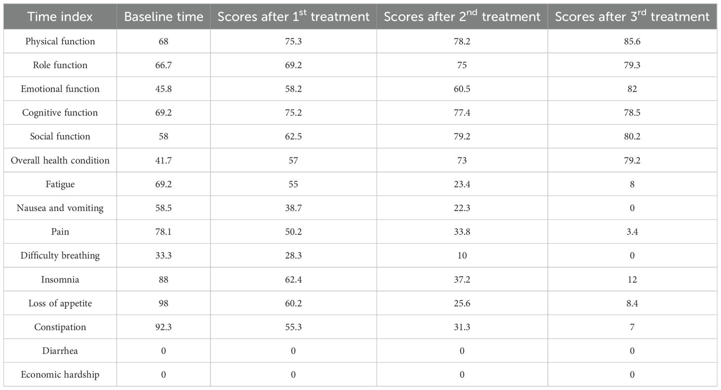 Regarding adverse reactions, no thrombocytopenia was observed during the three treatments. No fever occurred after the first treatment; however, the second treatment resulted in a rise in temperature (38.5°C), which subsided with symptomatic treatment. The third treatment caused a fever of 39°C accompanied by chills, which returned to normal after medication. Additionally, quality of life was evaluated during all three treatments using the EORTC QLQ-C30 scale (Table 3). Results showed improvements in six functional domains: physical, role, emotional, cognitive, social functions, and overall health, compared to pre-treatment levels. Fatigue, nausea and vomiting, pain, difficulty breathing, insomnia, loss of appetite, constipation, and diarrhea showed a decreasing or stable trend.
