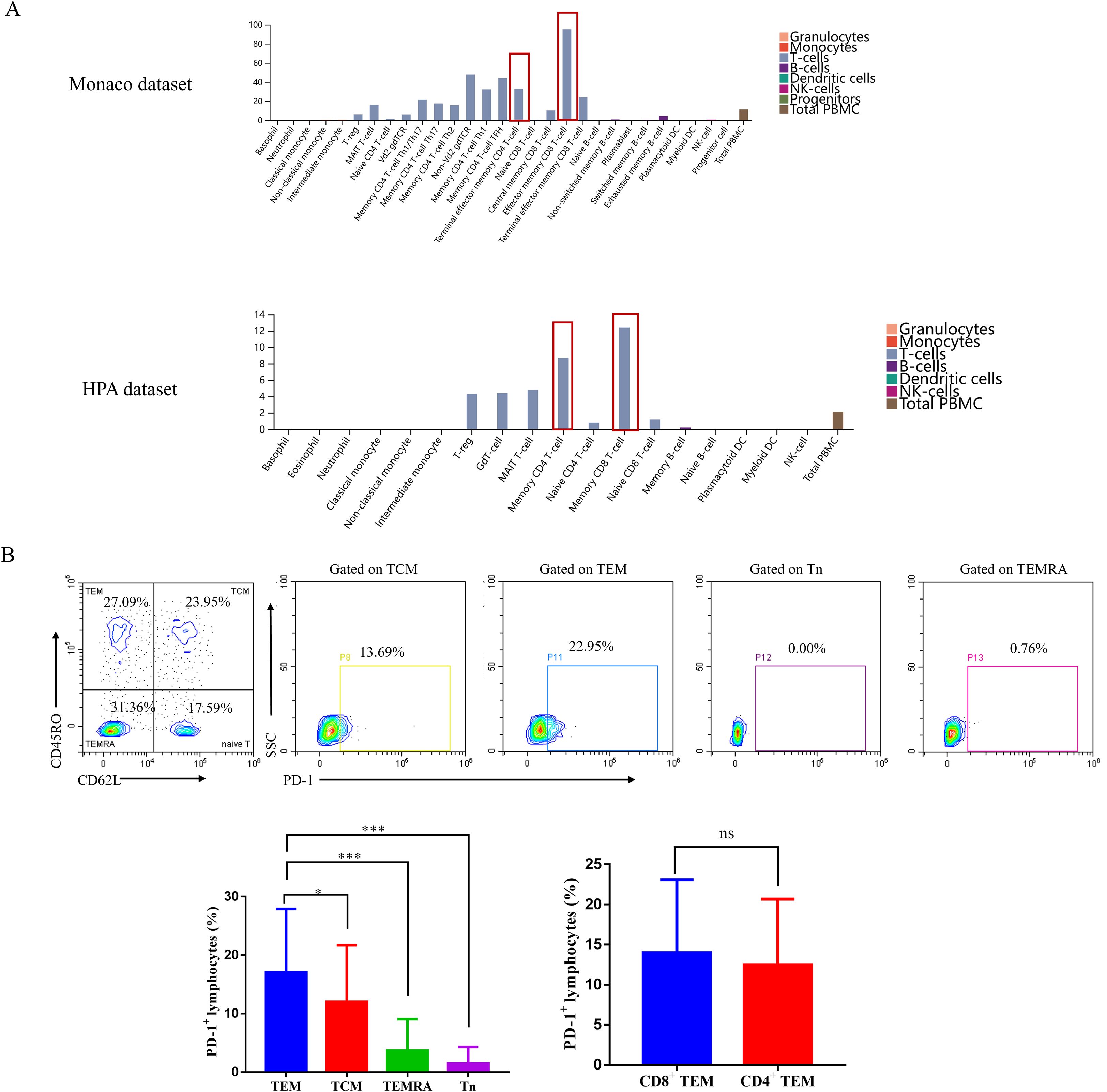 Figure 2. Effector memory T cells exhibited the highest PD-1 expression across memory T cell subsets in peripheral blood. (A) PD-1 expression of different immune cells in the blood in the HPA dataset and Monaco dataset. (B) The average percentage of PD-1+ cells in peripheral memory T lymphocytes in 54 advanced gastric cancer patients. Representative flow cytometry countor plots (the top of B) and summation data plots (the bottom of B). HPA, Human Protein Atlas. ***P < 0.001, *P < 0.05, ns, no significant.