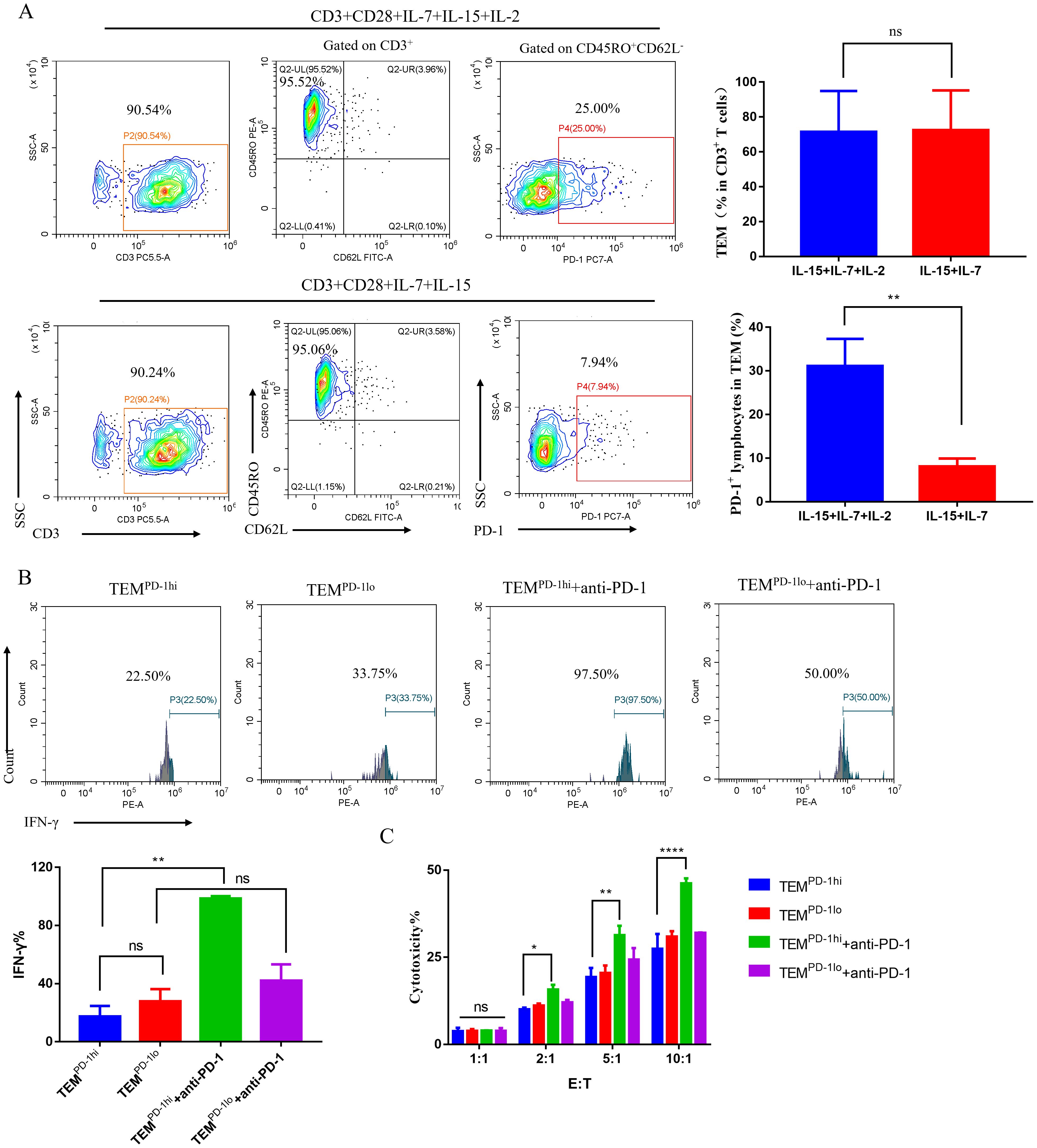 Figure 5. PD-1 blockade restores anti-tumor activity of PD-1+TEM cells in vitro. (A) TEM, PD-1+ lymphocytes in TEM in different culture methods at day 5. Representative flow cytometry countor plots (the left of A) and summation data plots (the right of A). (B) Comparison of IFN-γ secretion of TEM PD-1hi and TEM PD-1lo following incubation with MKN45 at designated E: T ratio of 5:1, Representative flow cytometry histogram (the top of B) and summation data plots (the bottom of B). (C) The cytotoxic reactivity of TEM PD-1hi and TEM PD-1lo was measured using CFSE/PI cytotoxicity assay, the target cells were MKN45. Abbreviations: TEM, effector memory T cells; TEMPD-1hi, TEM cells with high PD-1 expression; TEM PD-1lo, TEM cells with high low expression. The error bars represented mean±SEM (n=3, biologically independent samples); statistical significance was determined by two-tailed unpaired Student’s t-tests.****P <0.0001, **P <0.01, *P <0.05, ns, no significant.