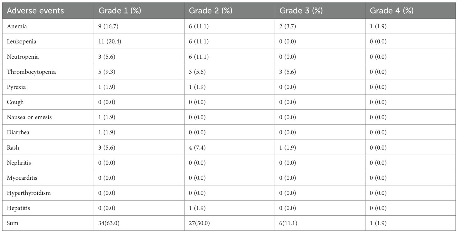 A total of 54 advanced GC patients treated with PD-1 inhibitors plus chemotherapy were included in the study and the baseline characteristics of the enrolled patients were summarized in Table 1. There were no differences in age, gender, metastasis, or other key variables between responders and non-responders, confirming that the groups were well-balanced and supporting the validity of our subsequent analyses. From January 2022 to December 2023, 54 patients with locally advanced or metastatic GC received at least two cycles of PD-1 inhibitors and underwent computed tomography (CT) imaging after the initiation of treatment at our institution (Figure 1). Follow up ended on December 31, 2023. Median patient age was 63 years (range 57–70 years) and 40 (74.1%) patients were men. Among the patients who could be evaluated for RECIST response, 25(46.3%) were PR, 18(33.3%) were SD for >6 months, and were defined as responders; 7(13.0%) were PD, 4(7.4%) were SD for <6 months, and were defined as non-responders. By December 2023, the median follow-up time was 12.9 months (range, 5.4–16.5 months). Table 2 indicates immune-related adverse events (irAEs) in patients with GC on anti-PD-1 immunotherapy. The majority of irAEs observed were grade 1–2 in severity and were resolved with symptomatic treatment according to National Comprehensive Cancer Network guidelines for managing immunotherapy-related toxicities. Responders had significantly higher PD-L1 combined positive score (CPS) (22C3(DAKO)) (P = 0.016) compared to non-responders. There were no statistically significant differences in gender, age, metastasis, tumor grade, surgical treatment, tumor markers including carcinoembryonic antigen (CEA), carbohydrate antigen 199 (CA199) and carbohydrate antigen 724 (CA724) between responders and non-responders.