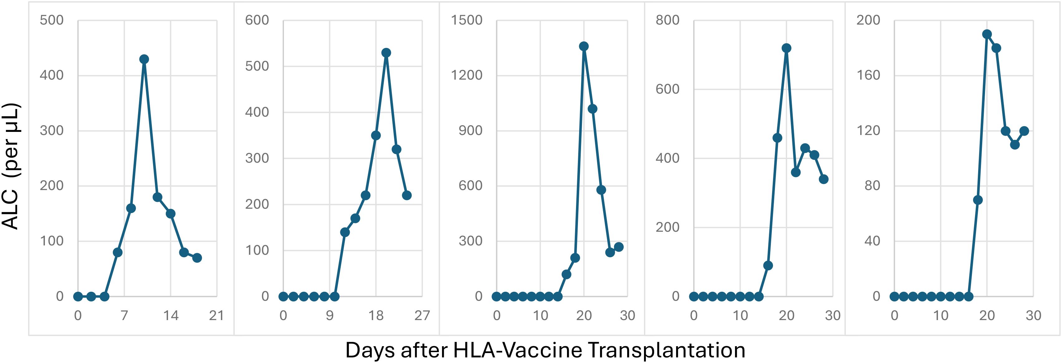 Figure 2. Absolute lymphocyte count. Absolute lymphocyte count (ALC) of the 5 patients peri-engraftment, demonstrating a pattern of transient surge in cell number followed by contraction.